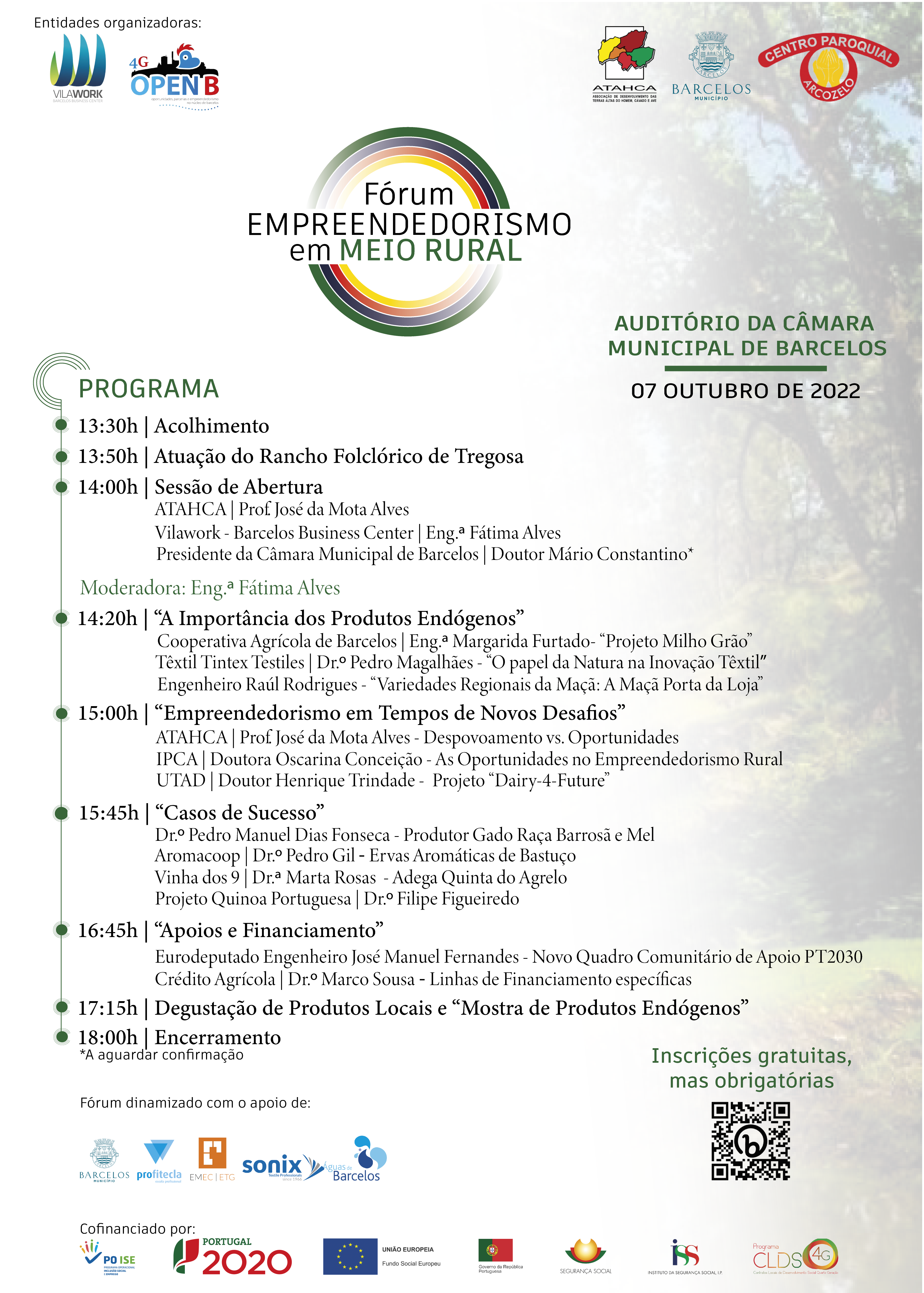 No âmbito da atividade n.º 5 "Incubadora de Âmbito Rural" do eixo 1 de Intervenção "Emprego, Formação e Qualificação", na qual se pretende incentivar a revitalização de profissões ancestrais como novas profissões, respeitando a identidade local, os usos e os costumes e os princípios da economia circular, destacando os modos de produção sustentável, através do desenvolvimento de start-ups", o Projeto CLDS 4G OPEN B, em parceria com a VilaWork - Barcelos Business Center, irá dinamizar um Fórum no próximo dia 7 de Outubro, no Auditório da Câmara Municipal de Barcelos das 13:30h às 18:00h, onde serão debatidos temas relacionados com o empreendedorismo em tempos de novos desafios, economia circular, produtos endógenos, casos de sucesso bem como apoios e financiamento no âmbito do Quadro Comunitário de Apoio Portugal 2030.