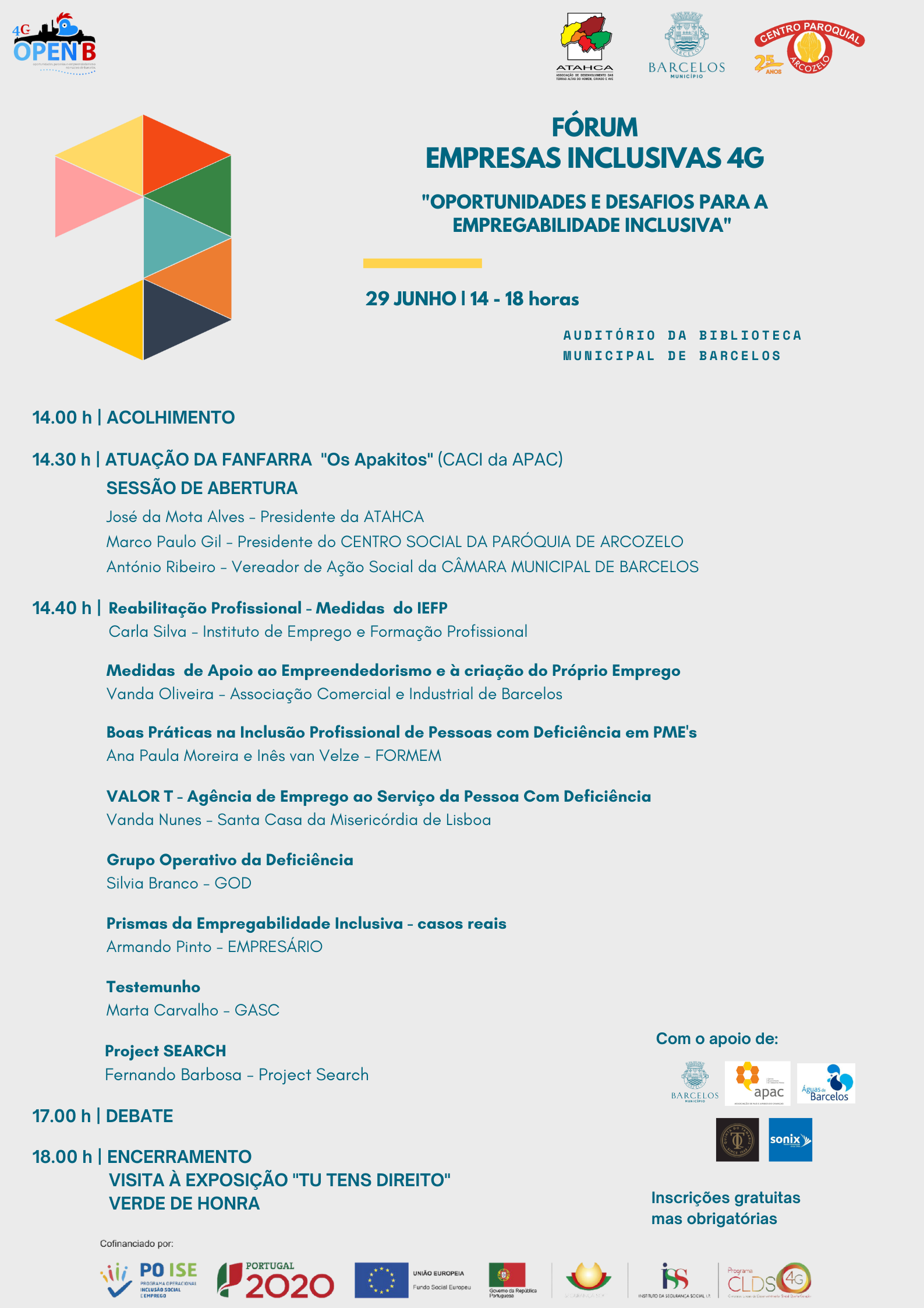 O projeto CLDS 4G OPEN B - Oportunidades, Parcerias e Empreendedorismo no Núcleo de Barcelos, desenvolvido pela ATAHCA, Câmara Municipal de Barcelos e Centro Social da Paróquia de Arcozelo, apoiado e cofinanciado pelo POISE- Programa Operacional Inclusão Social e Emprego e FSE - Fundo Social Europeu, irá dinamizar no âmbito do EIXO I de Intervenção- Emprego, Formação e Qualificação o "Fórum Empresas Inclusivas 4G- Oportunidades e Desafios para uma Empregabilidade Inclusiva", no próximo dia 29 de junho, quarta-feira, das 14h00 às 18h00, no Auditório da Biblioteca Municipal de Barcelos.