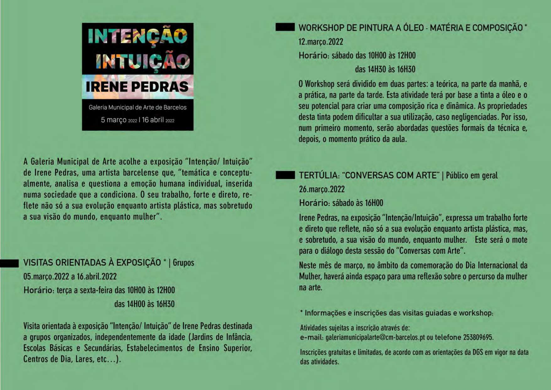Recorde-se que a Galeria tem patente, até 16 de abril, a exposição "Intenção/Intuição", de Irene Pedras, cujos trabalhos expressam não só a sua evolução enquanto artista plástica, mas, e sobretudo, a sua visão do mundo, enquanto mulher. Este será o mote para o diálogo desta sessão do "Conversas com Arte".