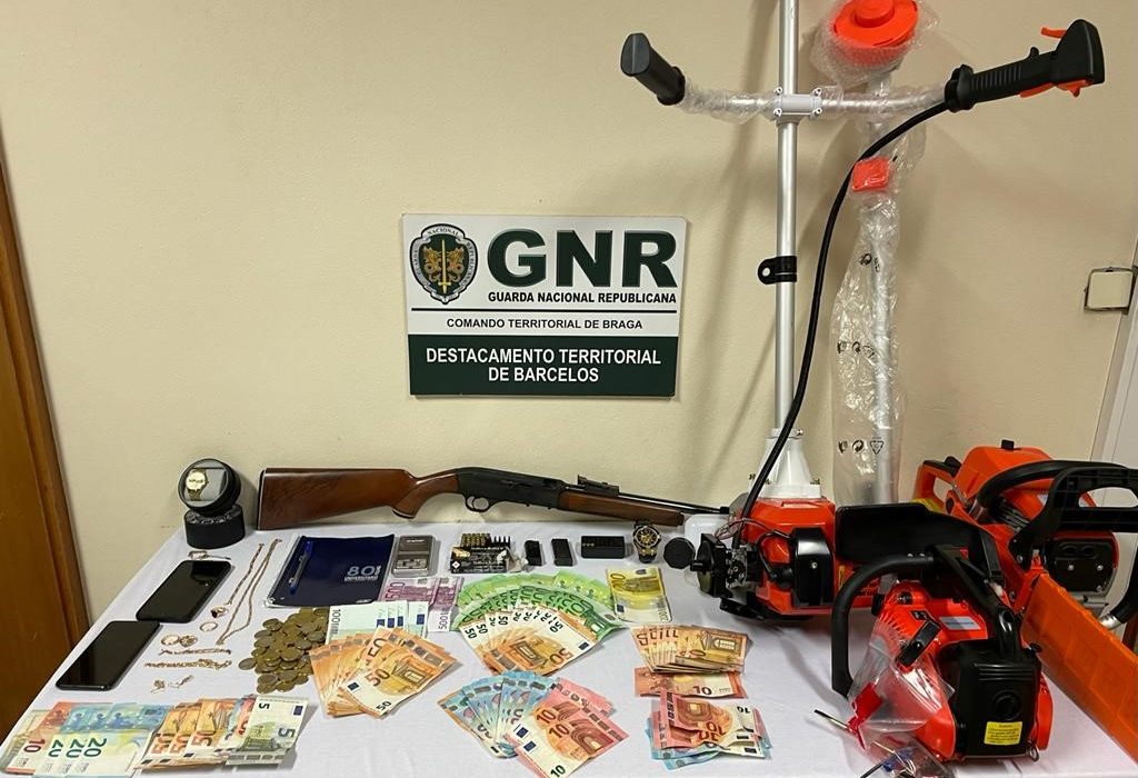 7 000 euros em numerário; Vários objetos em ouro; Uma arma transformada; Munições de vários calibres ; Duas motosserras, Duas roçadoras, Dois telemóveis; Uma viatura.