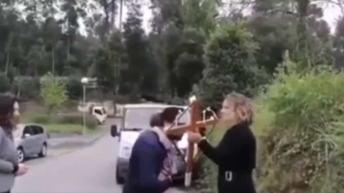Segundo a fonte, foram identificados uma mulher que segurava a cruz e a dava a beijar e um homem que terá colaborado na iniciativa.