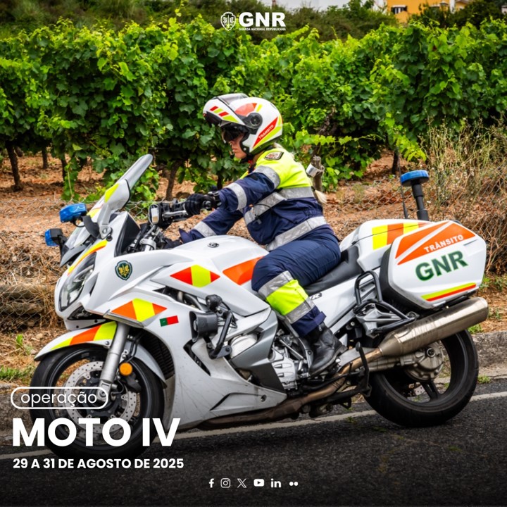 A Guarda Nacional Republicana (GNR), a partir de hoje, dia 29 de agosto, e até 31 de agosto, realiza uma operação de patrulhamento e fiscalização rodoviária, nas vias rodoviárias mais críticas da sua área de responsabilidade, direcionada para circulação de veículos de duas rodas a motor, com o objetivo de prevenir a ocorrência de acidentes de viação, garantir a segurança da circulação dos veículos, velar pelo cumprimento das normas rodoviárias e prestar o apoio a todos aos utentes das estradas.