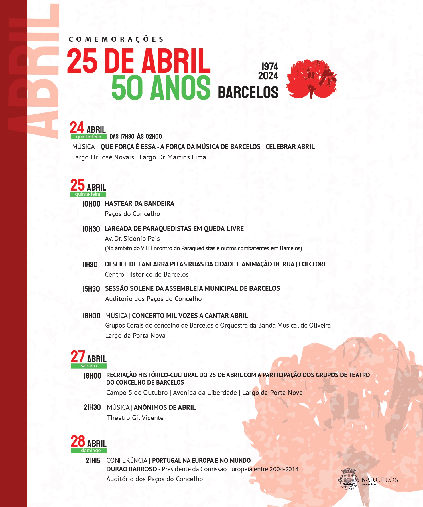 Ainda no âmbito das Comemorações dos 50 anos do 25 de Abril, decorrerá no dia 27 de abril, das 16h00 às 18h00, a Recriação Histórico-Cultural do 25 de Abril com a participação dos Grupos de Teatro do Concelho de Barcelos, que envolverá cerca de 150 atores.