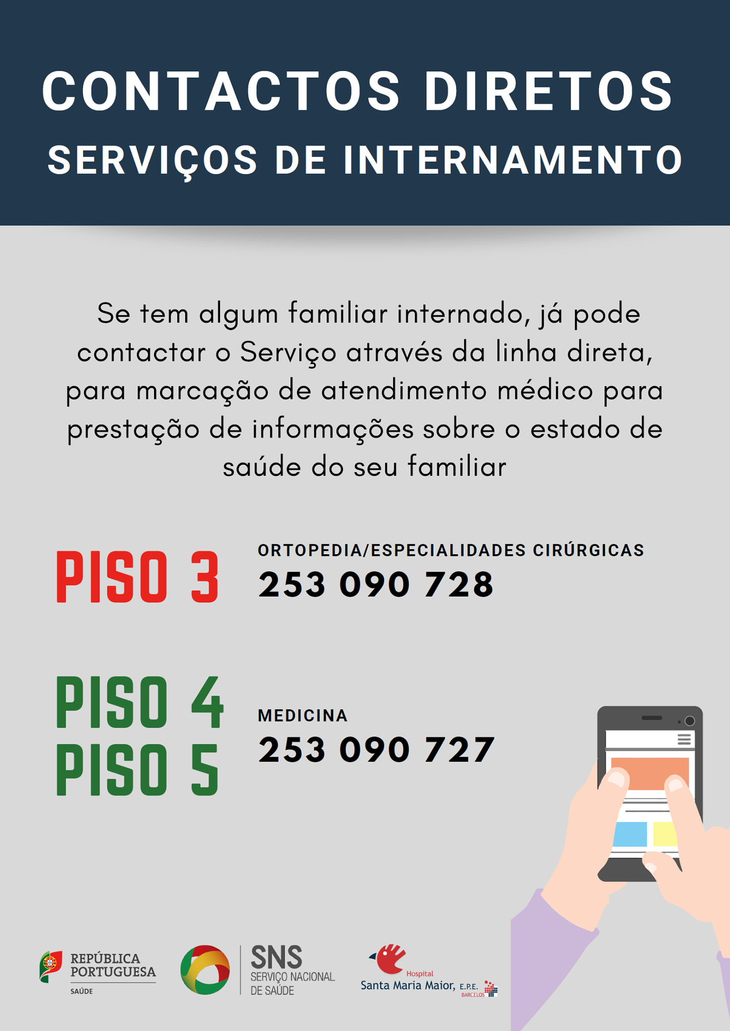 Os contactos para o Piso 3 ( Ortopedia e especialidades cirúrgicas) são o 253 090 728 e para Piso 4 e 5 na especialidade de Medicina são o 253 090 727