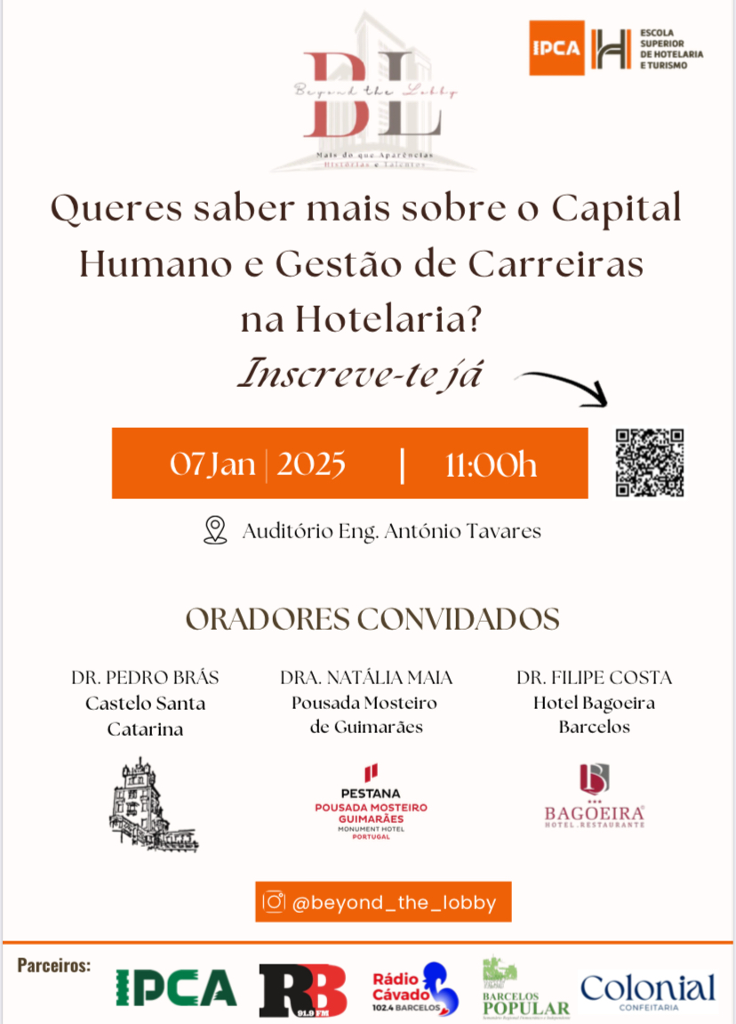 Os alunos finalistas da Licenciatura em Gestão Hoteleira do IPCA vão organizar um evento académico intitulado "Hotelaria 360º: Talento, Crescimento e Oportunidades", que terá lugar no dia 7 Janeiro de 2025, pelas 11h, no auditório Engº António Tavares. O evento insere-se no projecto multidisciplinar e tem como objectivo fomentar uma discussão abrangente sobre os desafios e oportunidades do capital humano e carreiras no sector hoteleiro. Para isso foram convidados os oradores Pedro Brás (Castelo Santa Catarina), Natália Maia (Pousada Mosteiro de Guimarães) e Filipe Costa (Hotel Bagoeira)