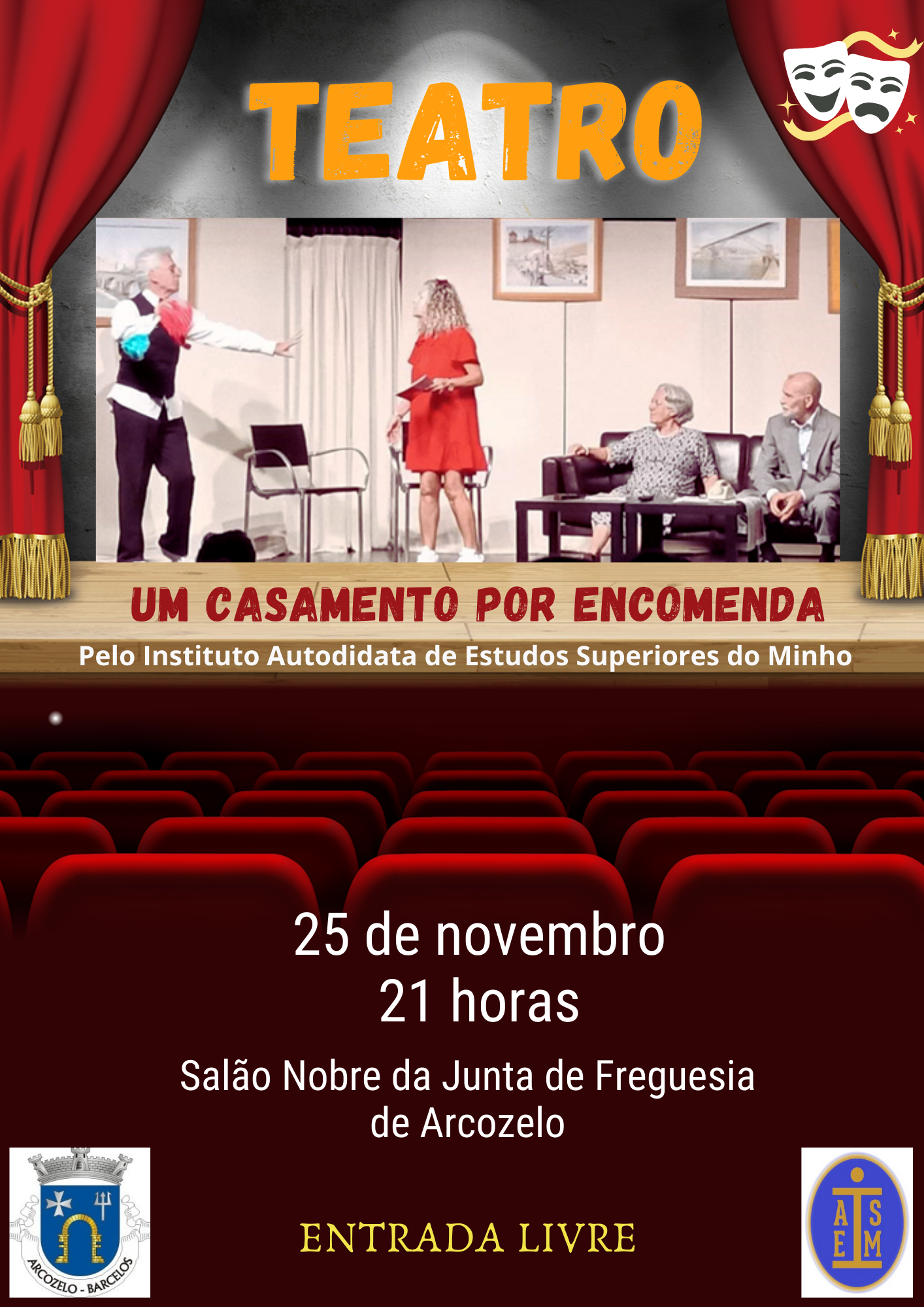 O Instituto Autodidata de Estudos Superiores do Minho (IAESM) vai apresentar uma peça de Teatro intitulada 'Um Casamento por encomenda' na Junta de Freguesia de Arcozelo, no dia 25 de novembro às 21 horas.