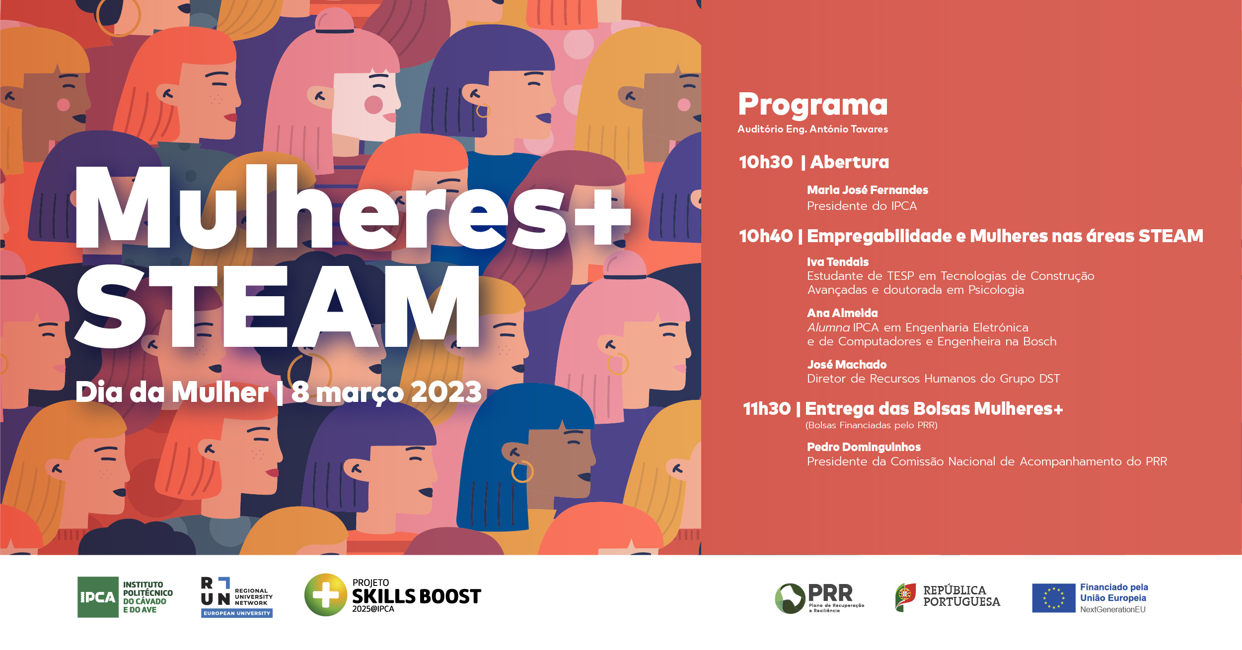 Segue-se a mesa-redonda com o tema Empregabilidade e Mulheres nas áreas STEAM, que conta com a estudante de CTeSP em Tecnologias de Construção Avançadas do IPCA e doutorada em Psicologia, Iva Tendais; a alumna em Engenharia Eletrónica e de Computadores do IPCA e Engenheira na Bosch, Ana Almeida; e o Diretor de Recursos Humanos do Grupo DST, José Machado. Pretende-se, através desta conversa, abordar o empoderamento das mulheres através das áreas STEAM.