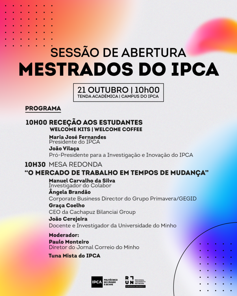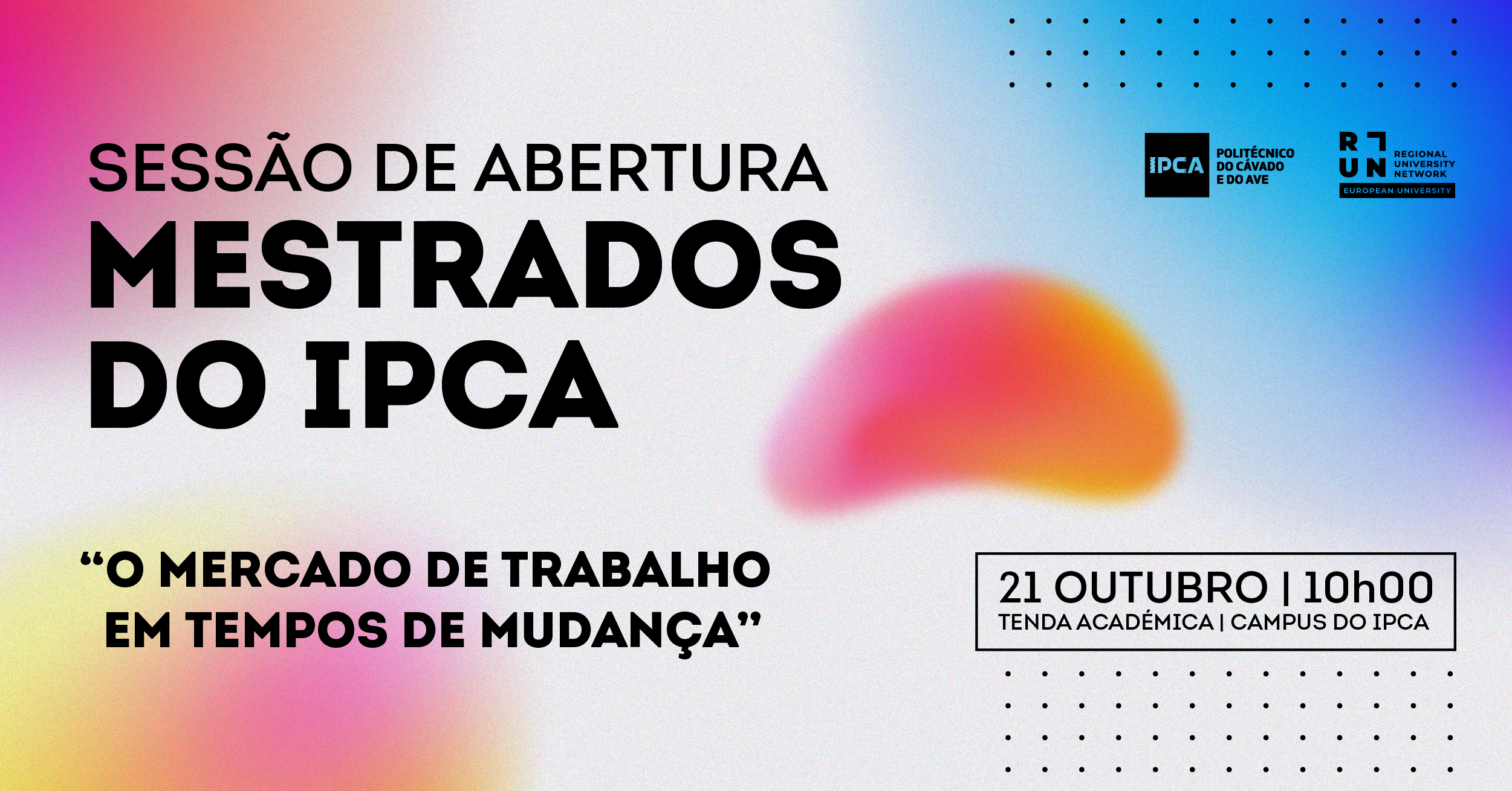 O Politécnico do Cávado e do Ave (IPCA) está a organizar uma sessão de abertura dos cursos de Mestrado e de Mestrado Profissional, a decorrer na Tenda Académica, no Campus do IPCA, em Barcelos, no próximo dia 21 de outubro, pelas 10h00.