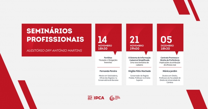 A iniciativa surge no âmbito da unidade curricular de “Seminários Profissionais”, da 10ª edição do Mestrado em Solicitadoria, que tem lugar no auditório Dr. António Martins, no edifício da Escola Superior de Gestão.
