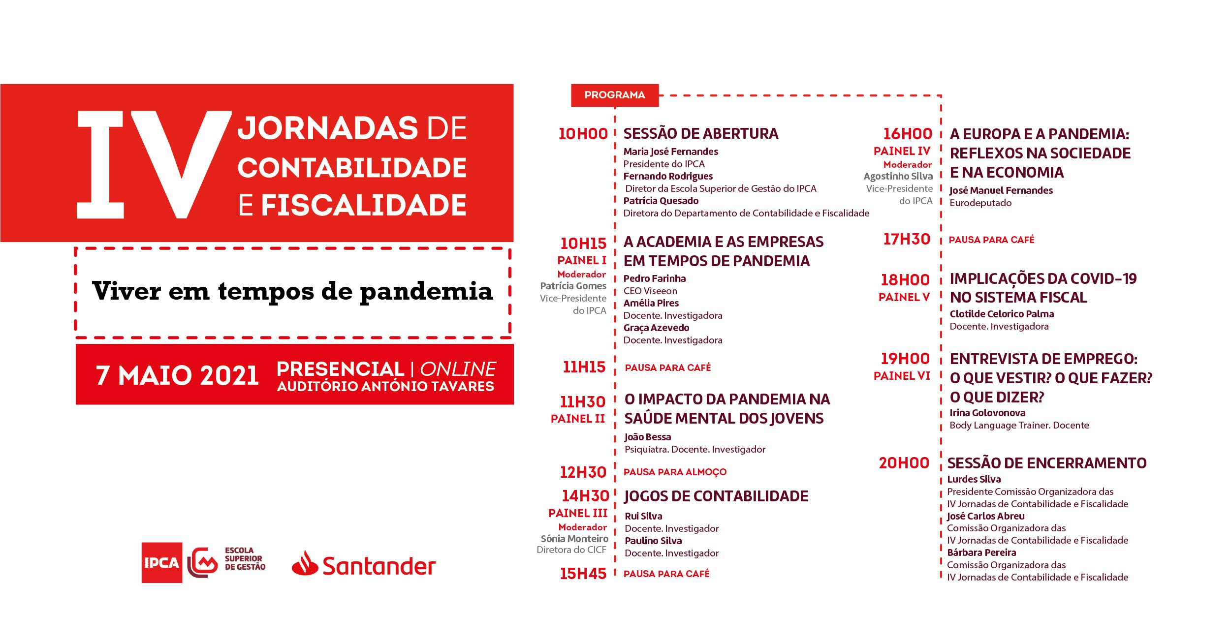 O Departamento de Contabilidade e Fiscalidade da Escola Superior de Gestão (ESG) do Instituto Politécnico do Cávado e do Ave (IPCA) realiza no dia 7 de maio as IV Jornadas de Contabilidade e Fiscalidade, subordinadas ao tema "Viver em tempos de pandemia".