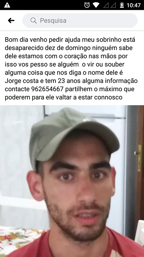 Jorge Costa saiu de casa sem telemóvel e sem avisar a família de que iria sair. Jorge vestia, na altura, umas calças azul clara de fazenda, um casaco de ganga e umas sapatilhas bege. Com 1,72m de altura, o rapaz tem ainda cabelo curto e é magro.