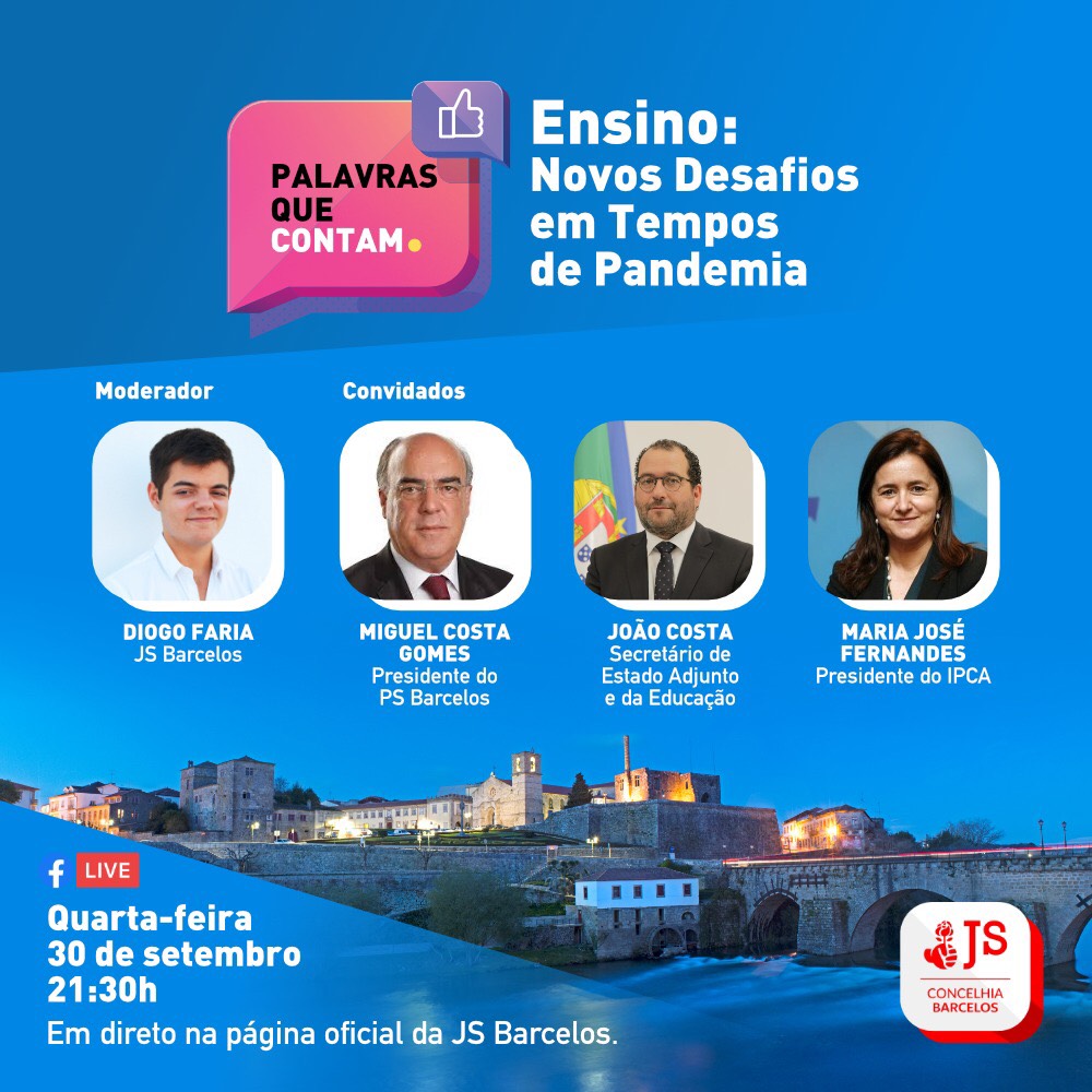 Nesta primeira edição a Juventude socialista vai contar com a presença de João Costa, Secretário de Estado Adjunto e da Educação, de Miguel Costa Gomes, Presidente do PS Barcelos e da Dra. Maria José Fernandes, Presidente do IPCA, para uma conversa sobre o Ensino e os novos desafios em tempo de pandemia. A sessão será moderada por Diogo Faria.