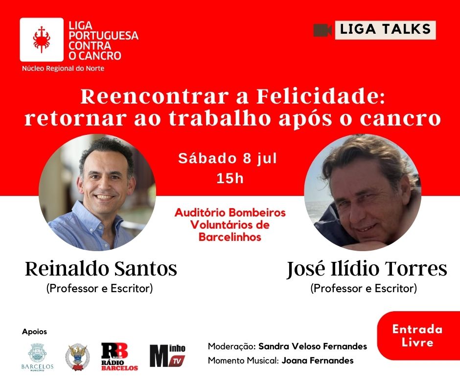 Junte-se a nós no próximo dia 8 de julho, às 15h, no auditório dos Bombeiros Voluntários de Barcelinhos, e escute as poderosas experiências dos professores Reinaldo Santos e José Ilídio Torres. Eles irão conversar sobre as suas experiências tanto no desenvolvimento e defesa de trabalhos como "a felicidade no trabalho é possível?", uma das questões mais críticas do nosso tempo e como doente oncológico que volta ao trabalho, respetivamente.