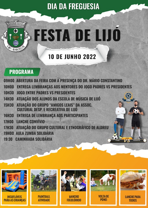 As festividades vão decorrer no feriado nacional do 10 de junho, a data histórica que dá o nome ao campo de jogos do Lijó Futebol Clube. Será precisamente este o local que irá receber todo o evento, ao longo do dia. Recuperar a tradição é o mote para as festividades de 2022, cujo programa inclui atividades de âmbito desportivo, cultural e musical.