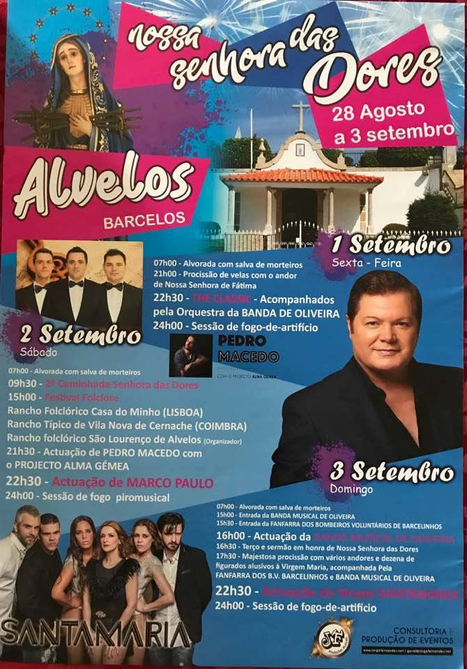 Na sexta-feira, após a procissão de velas atua o conjunto The Classic. No domingo, o ponto alto é a procissão às 17h30 e a festa em honra da Sra. das Dores encerra, à noite, com mais um grupo de renome, os Santa Maria.