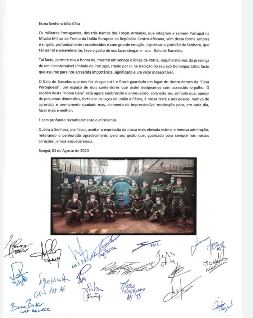 "Os militares portugueses em serviço na República Centro-Africana receberam uma ‘prenda’ especial: um Galo de Barcelos feito por Júlia Côta. O gesto foi retribuído numa carta enviada à própria Júlia Côta.
