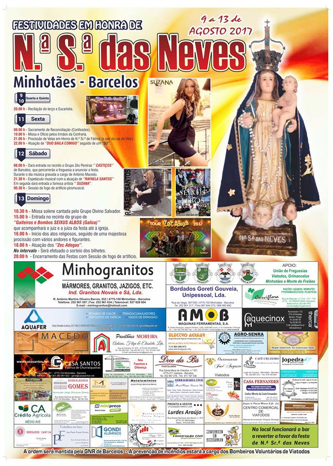Em Minhotães há festa no fim-de-semana em honra da Senhora das Neves. Amanhã, pelas 21h00 há procissão de velas seguida de concerto do Duo Baila Comigo. No sábado à noite, sobem ao palco as artistas Rafaela Santos e Suzana. No domingo, a procissão começa às 16h00 e no final atua o grupo Zec'Adegas.