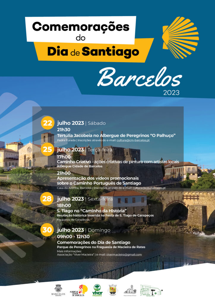 A iniciativa avança no dia 22, às 21h30, com a realização da tertúlia jacobeia no Albergue de Peregrinos "O Palhuço", em Pedra Furada. A participação nesta ação é gratuita, mas carece de inscrição, através do e-mail cultura@cm-barcelos.pt.No dia 25, às 17h00, no Albergue de Peregrinos "Cidade de Barcelos", é tempo de "Caminho Criativo" tema para o desenvolvimento de ações criativas de pintura com artistas locais. No mesmo dia, às 21h00, na Casa da Azenha, acontecerá a exibição de vídeos promocionais sobre o Caminho Português de Santiago.