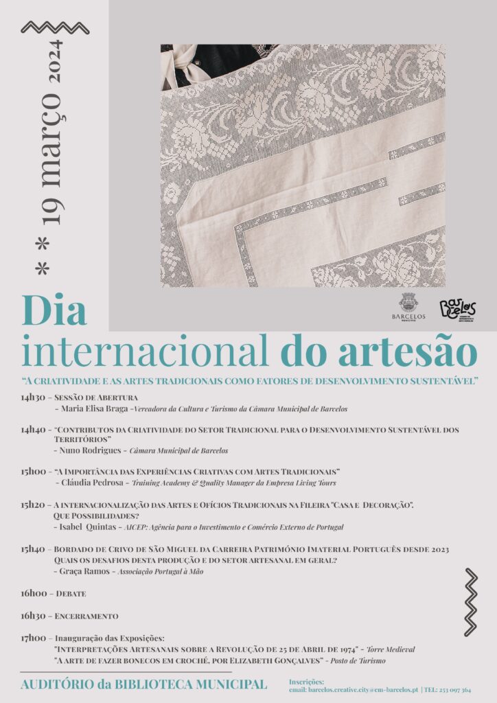O Município de Barcelos comemora, no próximo dia 19 março, às 14h30, o Dia do Artesão, realizando para o efeito a conferência "A Criatividade e as Artes Tradicionais como Fatores de Desenvolvimento Sustentável", na Biblioteca Municipal.