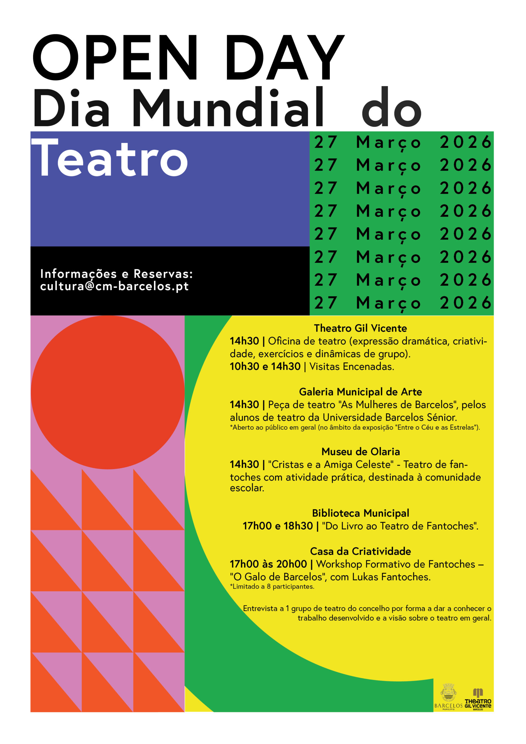 O Município de Barcelos vai assinalar o Dia Mundial do Teatro, celebrado a 27 de março, com a realização de um Open Day dedicado às artes performativas. A iniciativa decorre em vários espaços da cidade e apresenta uma programação diversificada, dirigida a públicos de todas as idades.