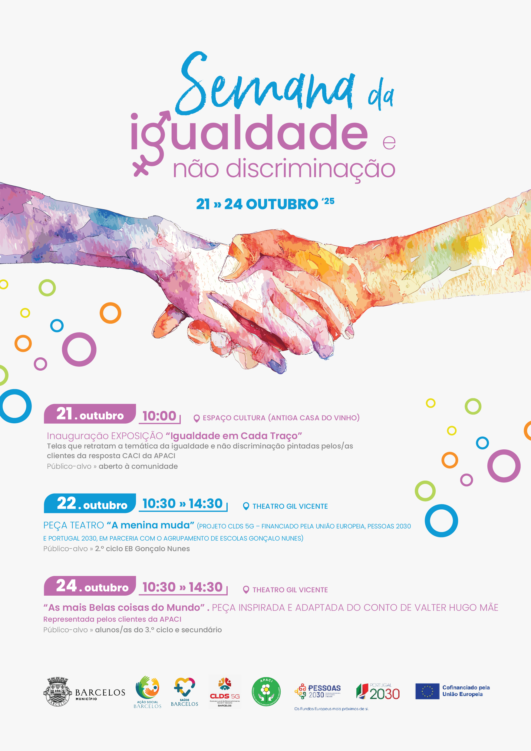 O Município de Barcelos, através da Divisão de Ação Social e Saúde, promove, entre os dias 21 e 24 de outubro, um conjunto de iniciativas culturais e artísticas dedicadas à igualdade e não discriminação, envolvendo a comunidade e parceiros locais na sensibilização para estes valores fundamentais.