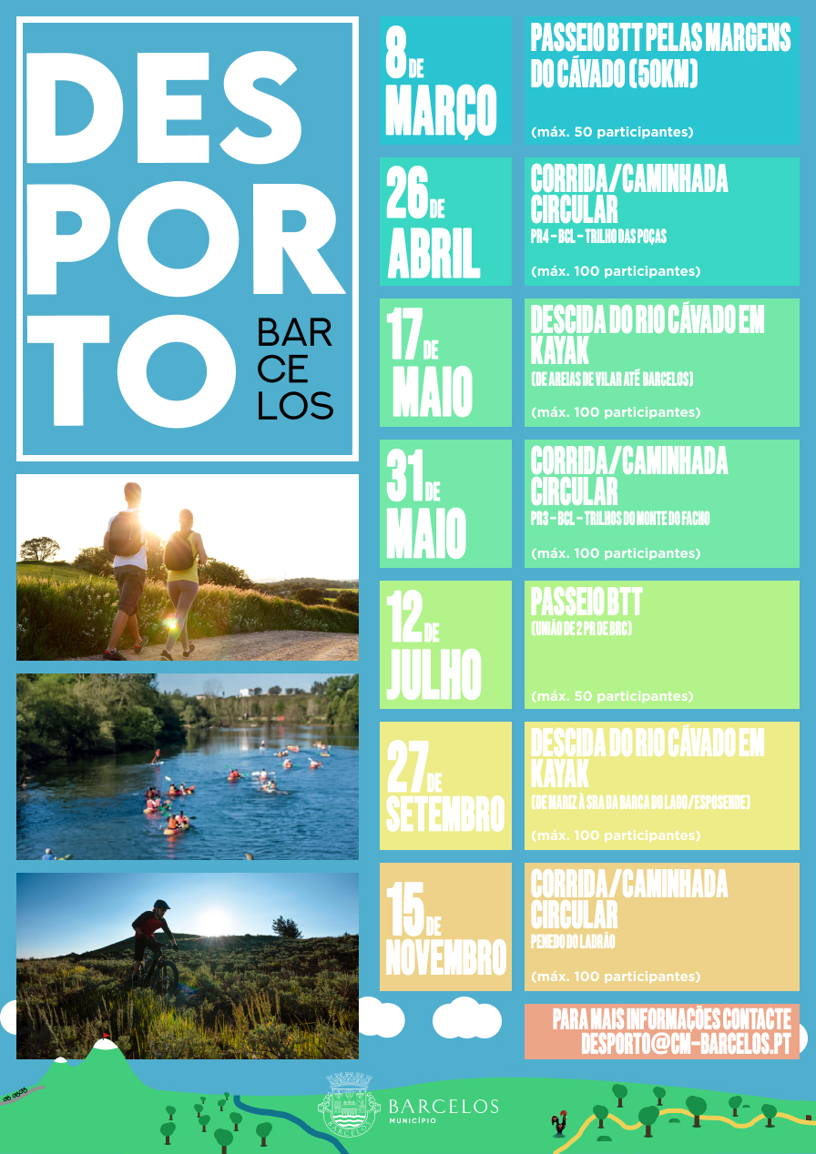 Entretanto, já pode marcar na sua agenda os dias 26 de abril, 17 de maio, 31 de maio, 12 de julho, 27 de setembro e 15 de novembro: no dia 26 de abril, realiza-se a corrida/caminhada circular pelo PR4 BCL – Trilho das Poças; no dia 17 de maio, a descida do rio Cávado em kayak, de Areias de Vilar até Barcelos, no dia 31 de maio, a corrida/caminhada circular pelo PR3 BCL – Pelos trilhos do Monte do Facho; no dia 12 de julho, um passeio BTT por dois percursos do "Caminhar para Conhecer Barcelos"; no dia 27 de setembro, a descida do rio Cávado em kayak, de Mariz à Capela da Nossa Senhora da Barca do Largo e, no dia 15 de novembro, uma corrida/caminhada circular pelo PR7 BCL – No Trilho do Penedo do Ladrão pelas lagoas de Enxate.