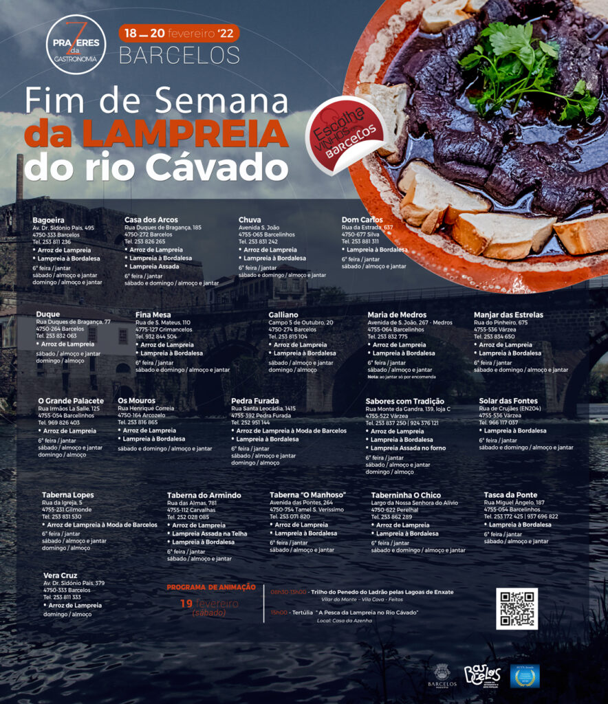Arroz de Lampreia, à bordalesa, ou ainda preparada no forno e até grelhada são as opções para degustar a lampreia, nos 20 restaurantes que aderiram ao fim de semana gastronómico promovido pelo Município de Barcelos. Entre 18 e 20 de fevereiro, este ciclóstomo (odiado por alguns) é razão de romaria para muitos outros amantes desta iguaria, que já faz parte do calendário gastronómico barcelense. Em paralelo, pode aproveitar o fim de semana para participar no Trilho do Penedo do Ladrão que liga Vilar do Monte e Vila Cova, no sábado, dia 19 de fevereiro, com início às 8h30. Durante a tarde, pelas 15h00, na Casa da Azenha, assista à tertúlia sobre a "Pesca da Lampreia no Rio Cávado". As inscrições nas atividades são obrigatórias e limitadas, até 17 de fevereiro, através do e-mail turismo@cm-barcelos.pt ou do telefone 253 811 882. Com este programa, o Município de Barcelos pretende dar continuidade à promoção de uma das especialidades gastronómicas da região do Minho, envolvendo os restaurantes locais numa perspetiva de dinamização da economia local. Para mais informações consulte www.cm-barcelos.pt.