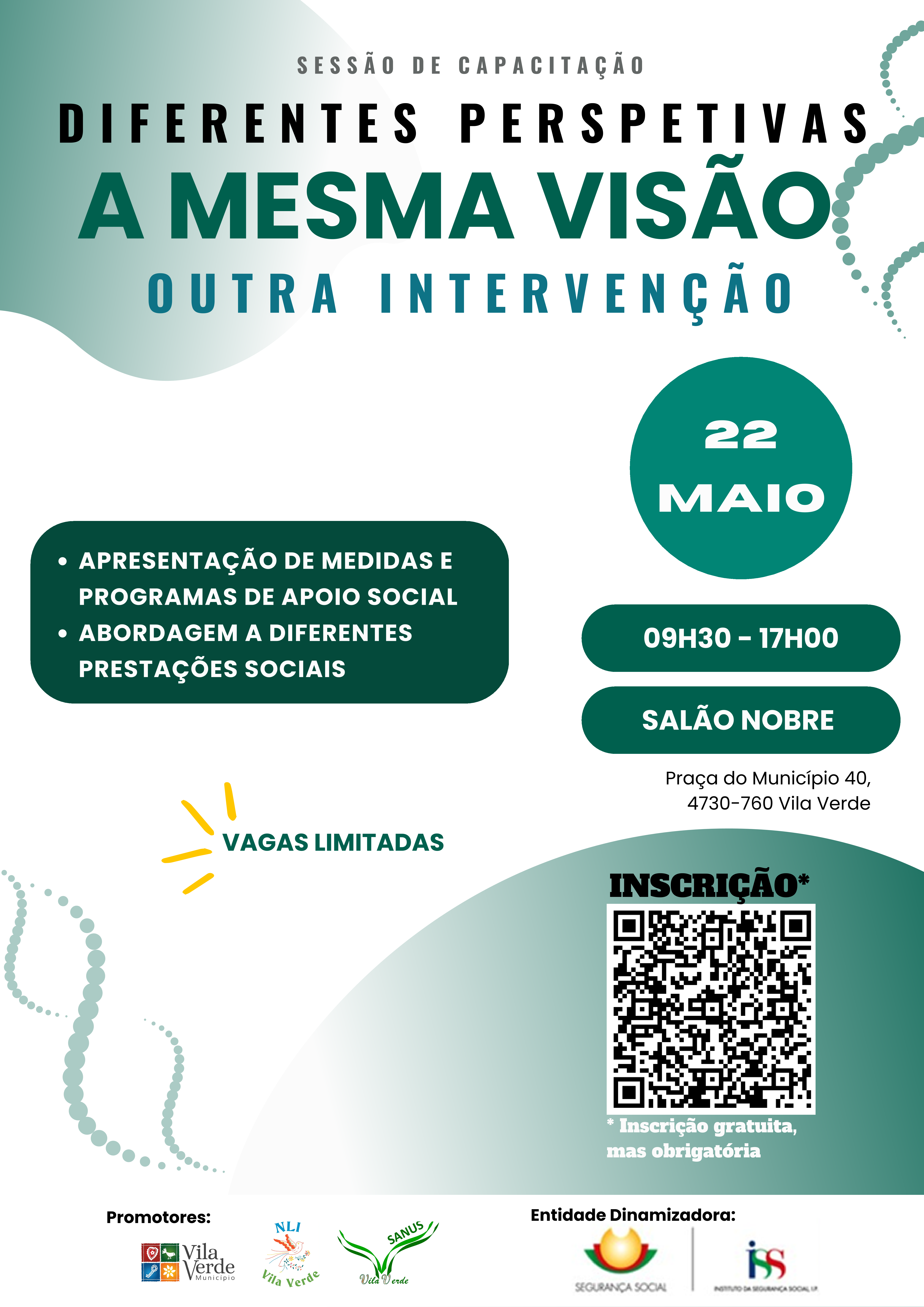 O Salão Nobre da Câmara Municipal de Vila Verde acolhe, no próximo dia 22 de maio, a sessão de capacitação "Diferentes Perspetivas, a Mesma Visão – Outra Intervenção", uma iniciativa dirigida a técnicos, agentes locais e à comunidade em geral, com o objetivo de aprofundar o conhecimento sobre medidas de apoio e prestações sociais existentes.