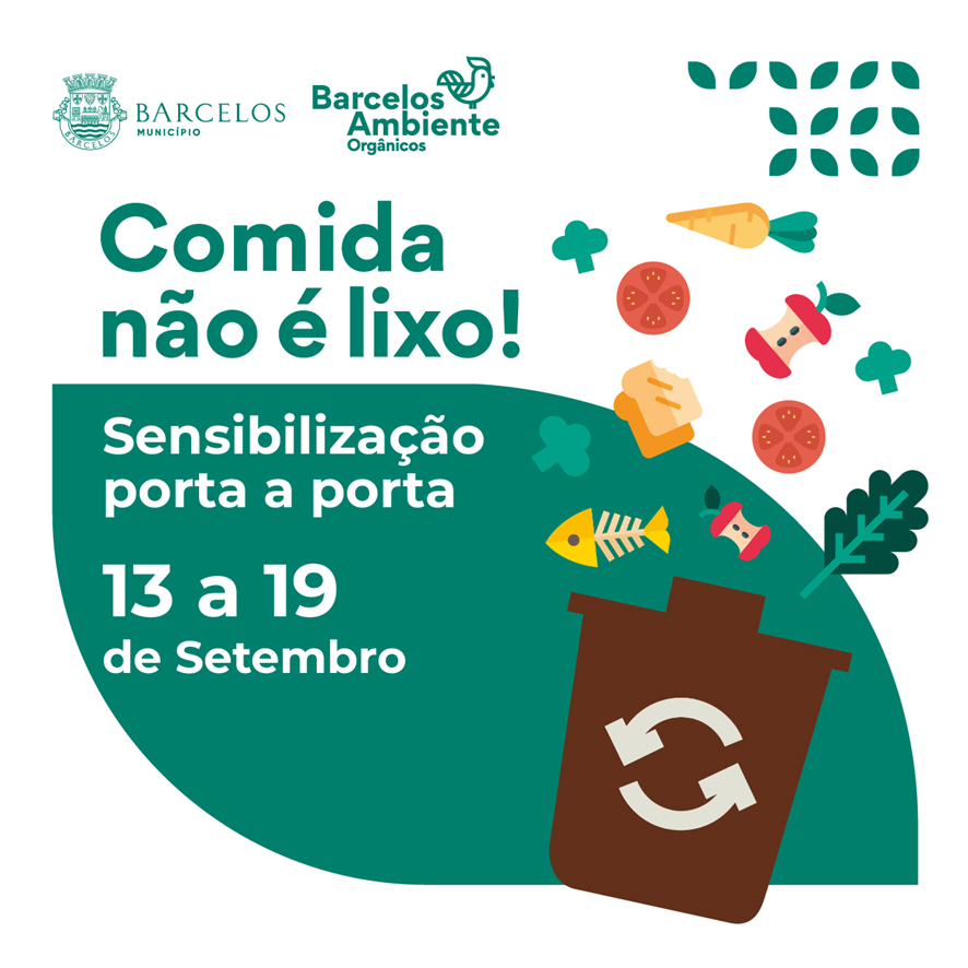A equipa de promotores da campanha "Comida Não é Lixo" vai realizar ações de sensibilização porta a porta, de 13 a 19 de setembro, percorrendo a Rua da Olivença (junto à Rotunda, Barcelos); a Rua Cândido da Cunha (Barcelos), a Travessa S. José (Urb. S. José, Barcelos), a Rua Dr. Aníbal Araújo (ponte pedonal, Arcozelo) e Praceta Fernando Lopes (Vila Frescainha S. Martinho).