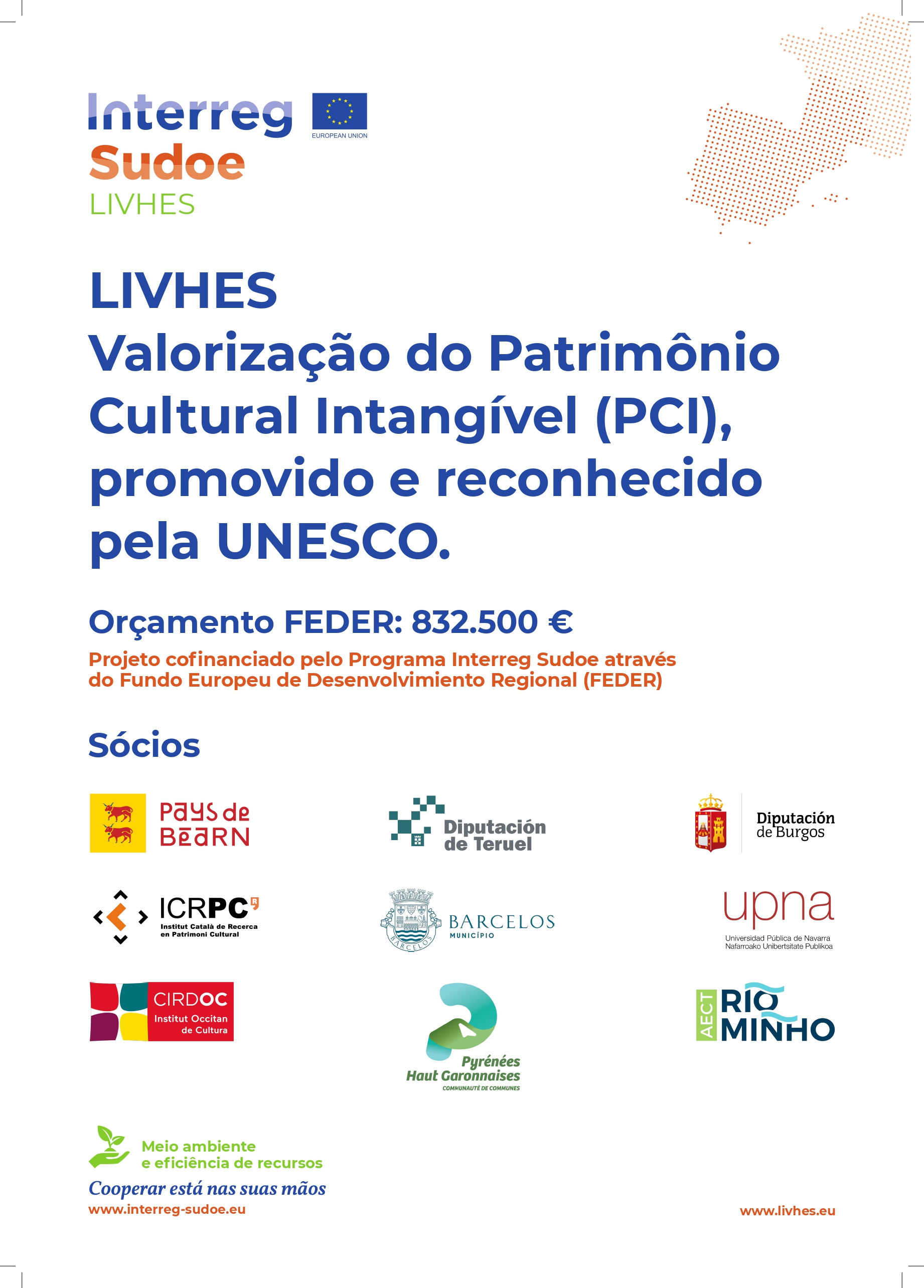 O Município de Barcelos vai participar na reunião da 1ª Mesa Transnacional "La cultura inmaterial como elemento de desarrollo local. El Patrimonio Cultural Inmaterial desde el río Miño transfronterizo", no âmbito do Projeto LIVHES "Living Heritage for Sustainable Development", em Valença, na sede do Agrupamento Europeu de Cooperação Territorial do Rio Minho, no próximos dias 24, 25 e 26 de novembro. A mesa transnacional será um fórum de intercâmbio e reflexão que se refletirá na análise das boas-práticas identificadas pelos parceiros, para o desenvolvimento de uma metodologia comum de valorização do património imaterial e uma estratégia adaptada a cada região participante e às realidades dos diferentes territórios SUDOE, em colaboração com os principais atores territoriais que administram, divulgam e participam de diferentes manifestações culturais relacionadas a festas, danças, tradição oral ou artesanato. O projeto LIVHES conta com 9 entidades de Espanha, França e Portugal, e foi aprovado na última convocatória do programa Interreg Sudoe, inserindo-se no eixo 5 "Ambiente e eficiência de recursos". Tem como objetivo responder a uma necessidade europeia e a um desafio territorial partilhado pelas áreas pouco povoadas do sul da Europa, compreendendo o Património Cultural Imaterial reconhecido pela Unesco como instrumento de desenvolvimento. São parceiros do Município de Barcelos o Agrupamento Europeu de Cooperação Territorial do Rio Minho (PT), o Pôle Métropolitain Pays de Béarn (FR), o Institut Occitan de Culture (FR), a Communauté de Communes Pyrénées Haut Garonnaises (FR), a Diputación Provincial de Teruel (ES), a Diputación Provincial de Burgos (ES), a Fundació Institut Català de Recerca en Patrimoni Cultural (ES), e a Universidade Pública de Navarra (ES). O Interreg Sudoe é a Iniciativa Comunitária para a Cooperação Transnacional Sudoeste em Ordenamento do Território e Desenvolvimento Regional para o Fundo Europeu de Desenvolvimento Regional (FEDER).