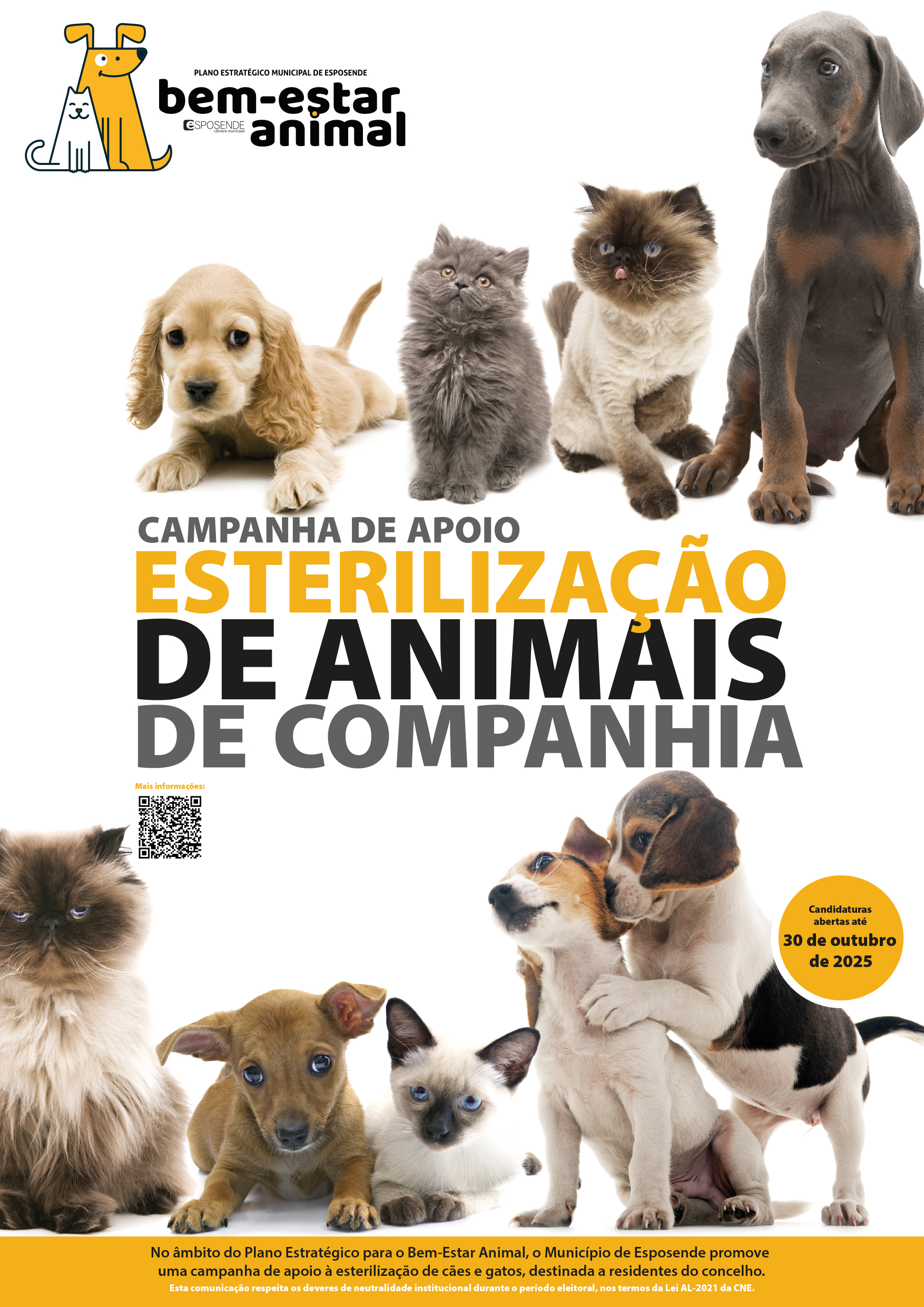 O Município de Esposende informa que se encontra em curso uma nova campanha de apoio à esterilização de animais de companhia, designadamente cães e gatos, cujos detentores residam no concelho. Esta iniciativa enquadra-se no Plano Estratégico para o Bem-Estar Animal e visa contribuir para o controlo da população animal e para a promoção da saúde pública e do bem-estar animal.