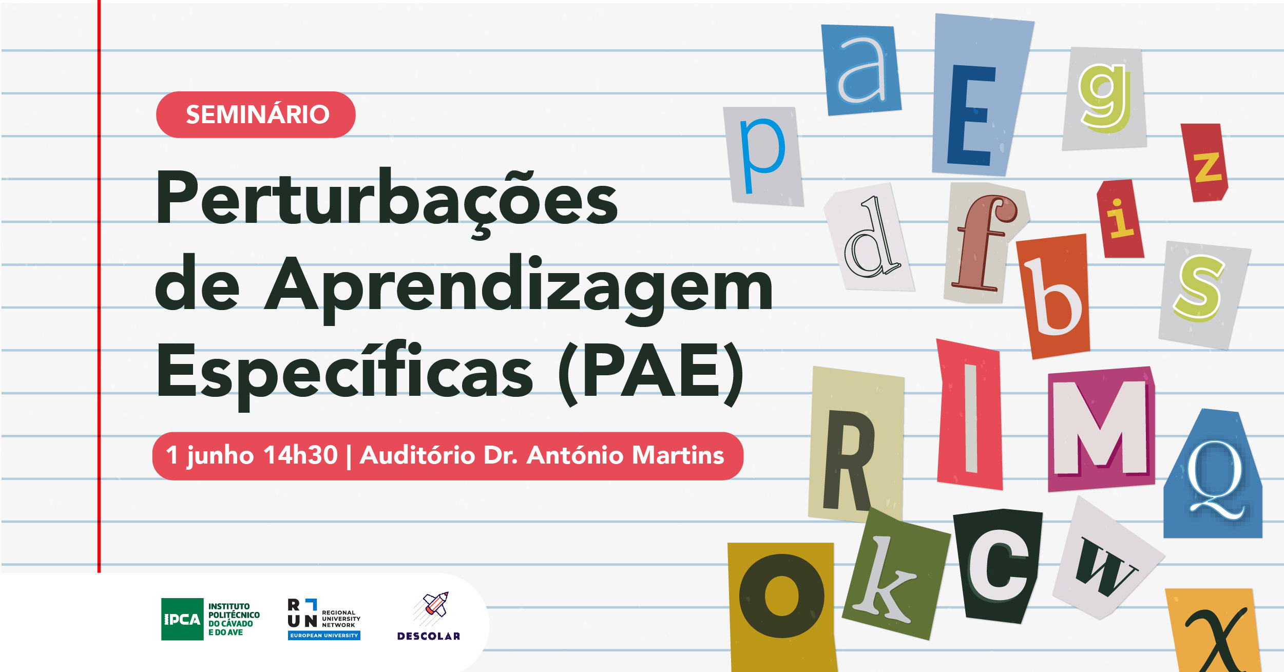 No dia 1 de junho, Dia Mundial da Criança, o IPCA e a Descolar, vão refletir sobre as "Perturbações de Aprendizagem Específicas". A Descolar é uma associação de apoio à criança com perturbações de aprendizagem específicas, défice na leitura (dislexia), na escrita (disortografia/disgrafia) e/ou na matemática (discalculia) que se junta agora ao IPCA num seminário que pretende dar a conhecer várias realidades do Empreendedorismo no âmbito da Dislexia.
