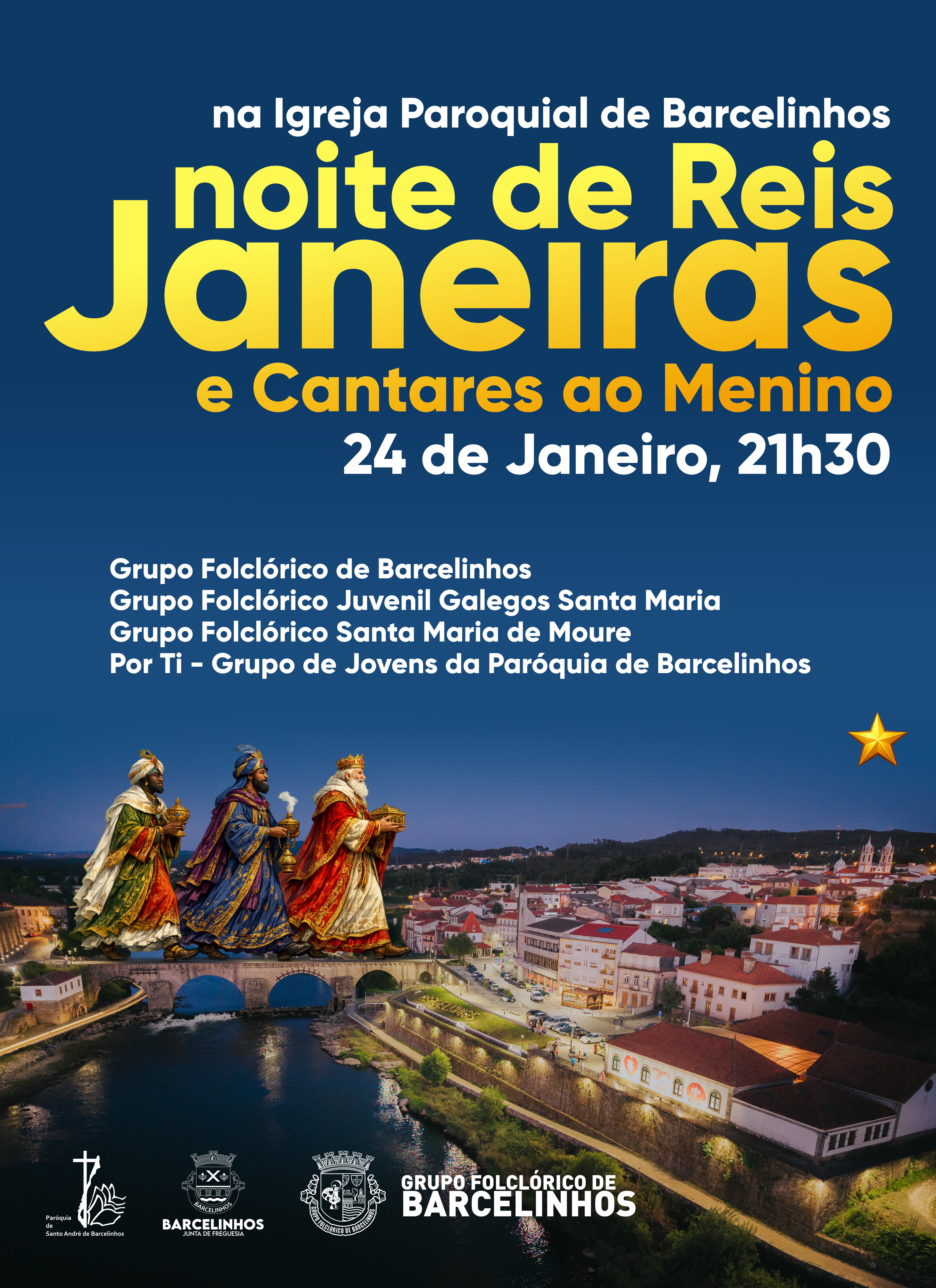 O evento contará com as participações do Grupo Folclórico de Barcelinhos, do Grupo Folclórico Juvenil de Galegos Santa Maria, do Grupo Folclórico Santa Maria de Moure e do POR TI - Grupo de Jovens de Barcelinhos proporcionando ao público o que de melhor se faz na Região na preservação de Canções de Reis, Janeiras e Cantares ao Menino.