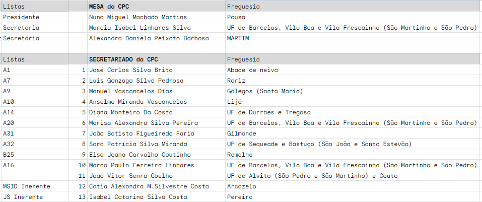 Para a eleição da Mesa apresentou-se apenas uma lista encabeçada por Nuno Martins e integrando Márcia Silva e Alexandra Barbosa, tendo sido eleita com 57 votos a favor.
