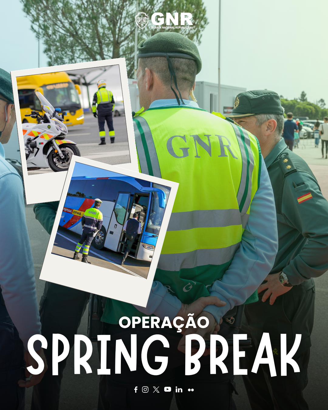 A Guarda Nacional Republicana (GNR) irá realizar, entre os dias 24 de março e 13 de abril, a Operação "Spring Break 2025", em todo o território nacional, com o objetivo de alertar os alunos finalistas para a necessidade de evitarem comportamentos de risco, bem como garantir a segurança rodoviária nos seus deslocamentos e a segurança nos estabelecimentos e zonas de diversão noturna em Portugal.