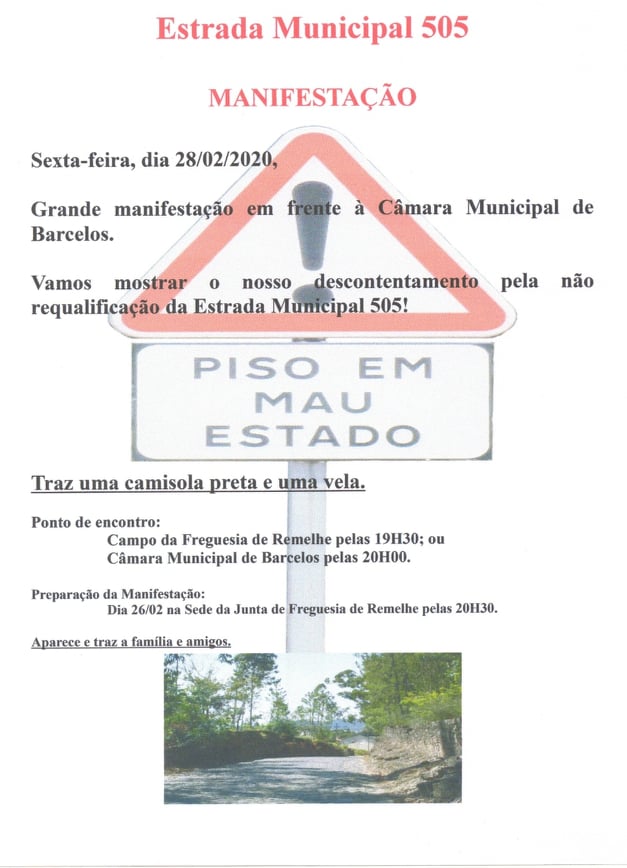 A população da freguesia de Remelhe juntou-se e organizou para esta sexta-feira, uma manifestação junto à Câmara Municipal de Barcelos, em protesto contra a não requalificação da Estrada Municipal 505.