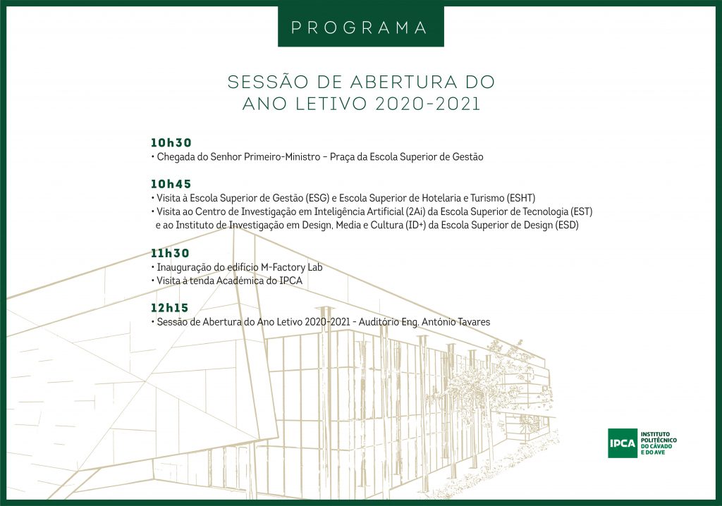 A visita do Primeiro-Ministro incluirá a passagem pelas Escolas, onde terá oportunidade de assistir a uma aula presencial e uma aula em regime híbrido (com estudantes em sala de aula e estudantes a participar à distância através do uso de smart board, sistema de som e câmara e outras ferramentas adequadas ao modelo de ensino híbrido), visita aos laboratórios de investigação e ainda falar aos novos estudantes que estarão representados na "Tenda Académica do IPCA".