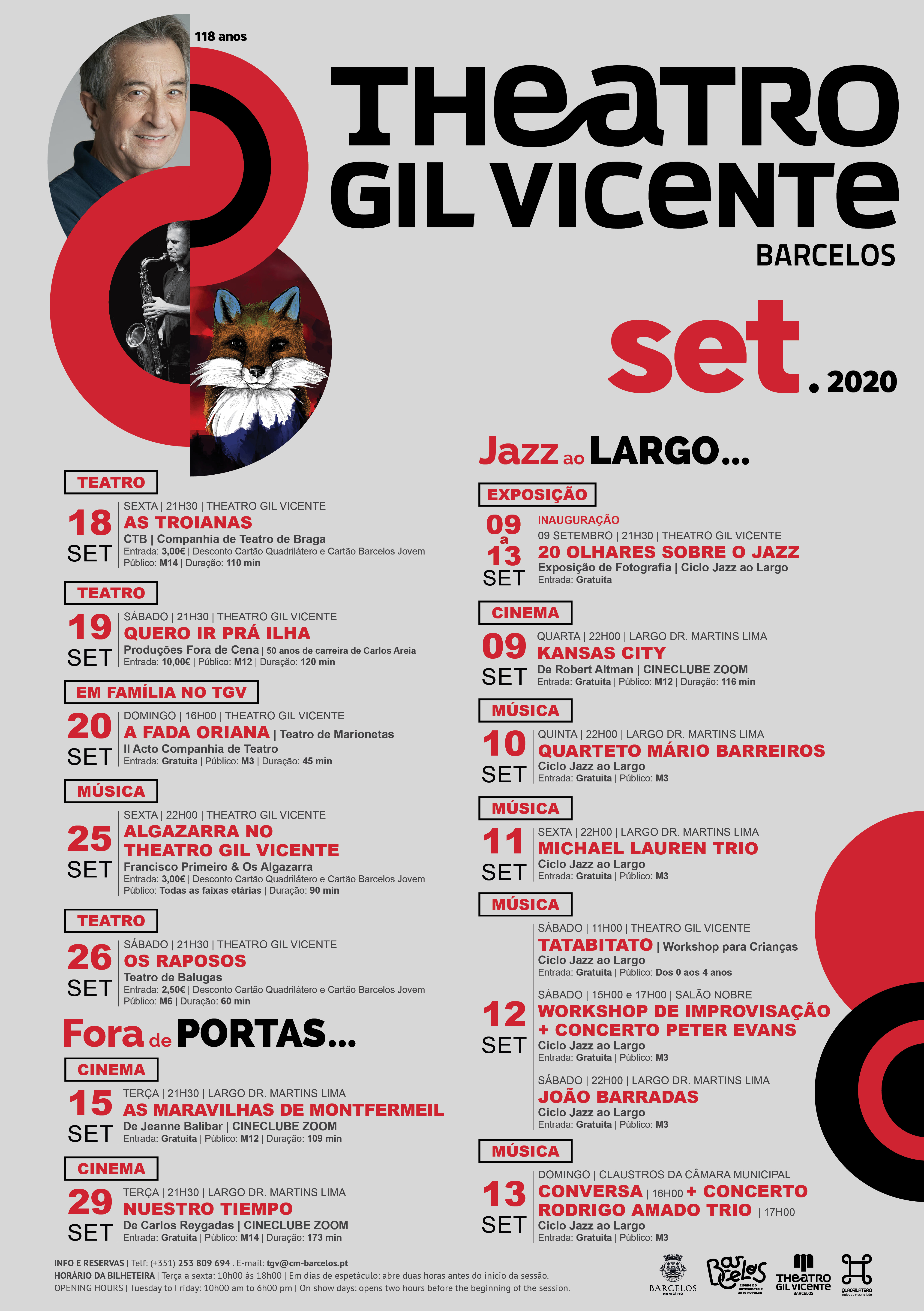 O ciclo do Jazz ao Largo reabre a programação do Theatro Gil Vicente depois do interregno causado pela pandemia Covid-19. Entre 9 e 13 de setembro o Jazz ao Largo traz a Barcelos além de muita música, uma exposição de fotografia, que estará patente no interior do Theatro Gil Vicente intitulada "20 olhares sobre o jazz" de João Sousa e Miguel Estima. O cinema também tem lugar neste ciclo de jazz com o filme "Kansas City", que irá para a tela no Largo Dr. Martins Lima, no dia 9, pelas 22h00, em parceria com o Cineclube Zoom.