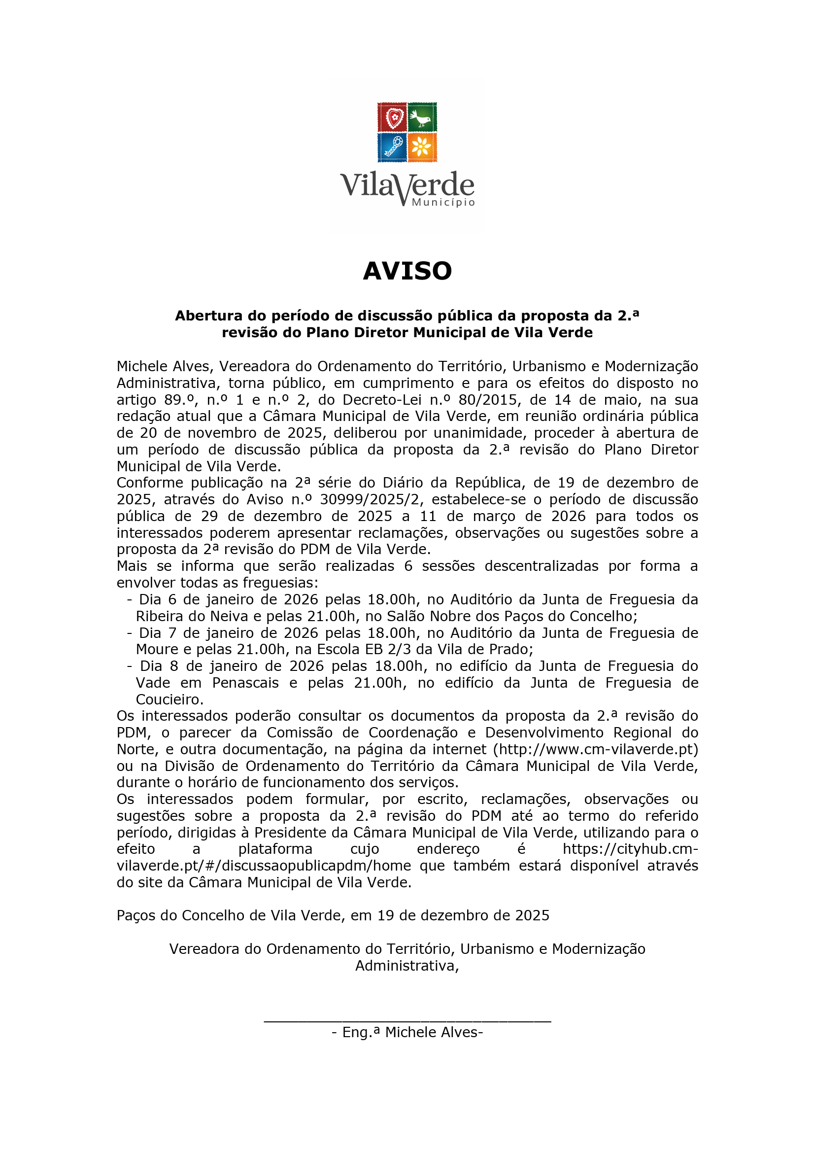 Conforme estipula o aviso publicado em Diário da República e aprovado pelo executivo camarário, no período de 50 dias úteis todos os interessados podem apresentar "reclamações, observações ou sugestões sobre a proposta da 2ª revisão do PDM de Vila Verde".