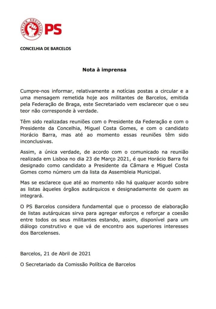 A tomada de decisão final caberá à direção nacional do Partido socialista.