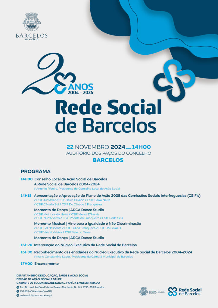 A Câmara Municipal comemora, no próximo dia 22 de novembro, os 20 anos da criação da Rede Social de Barcelos (2004-2024). Com um vasto programa de atividades, este é um marco significativo no percurso desta estrutura que, ao longo de duas décadas, tem potenciado o trabalho colaborativo no concelho, intervindo em diversas áreas sociais e contribuindo, através de inúmeras parcerias, para o desenvolvimento da comunidade. Enquanto estrutura governativa local, a Rede Social de Barcelos surgiu no contexto de afirmação de uma nova geração de políticas sociais ativas, baseadas na responsabilização e mobilização do conjunto da sociedade local e de cada indivíduo, através da articulação e congregação de esforços. Pela ocasião do seu vigésimo aniversário, destaca-se o trabalho de reativação das Comissões Sociais Interfreguesias no território do concelho, que são o reflexo de um trabalho de proximidade e parceria em prol das pessoas e do seu bem-estar.