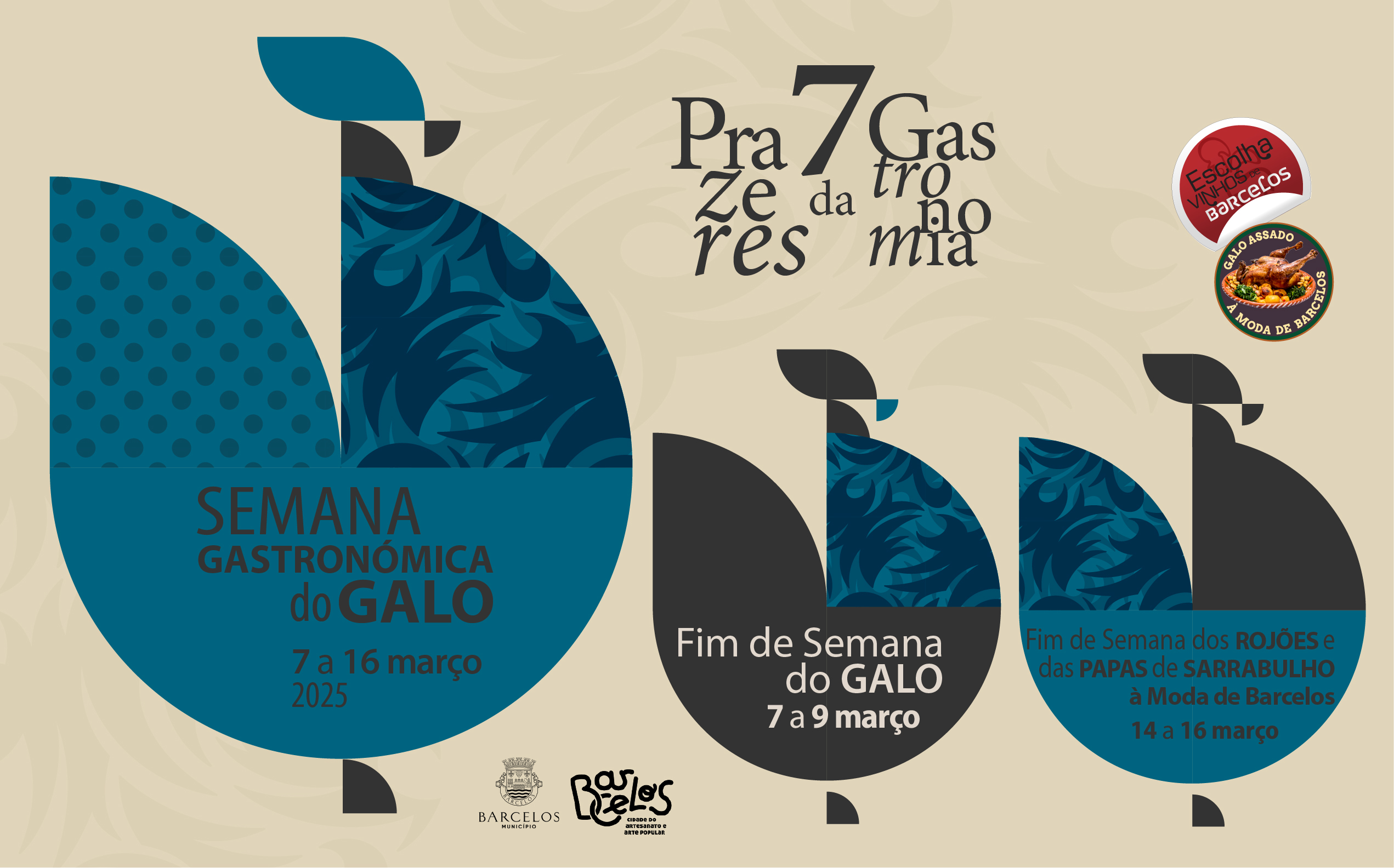O Galo é primeiro prato a ser servido. De de 7 a 9 de março, nos 34 restaurantes aderentes a esta iniciativa do Município, o galináceo vai à mesa na sua forma gastronómica mais tradicional, "à Moda de Barcelos", ou seja, recheado, assado e acompanhado com batatas e arroz. Para outros gostos e palatos, há as opções do arroz pica no chão, do galo estufado, ou do galo à Primavera acompanhado com o tradicional arroz de merendeiro.