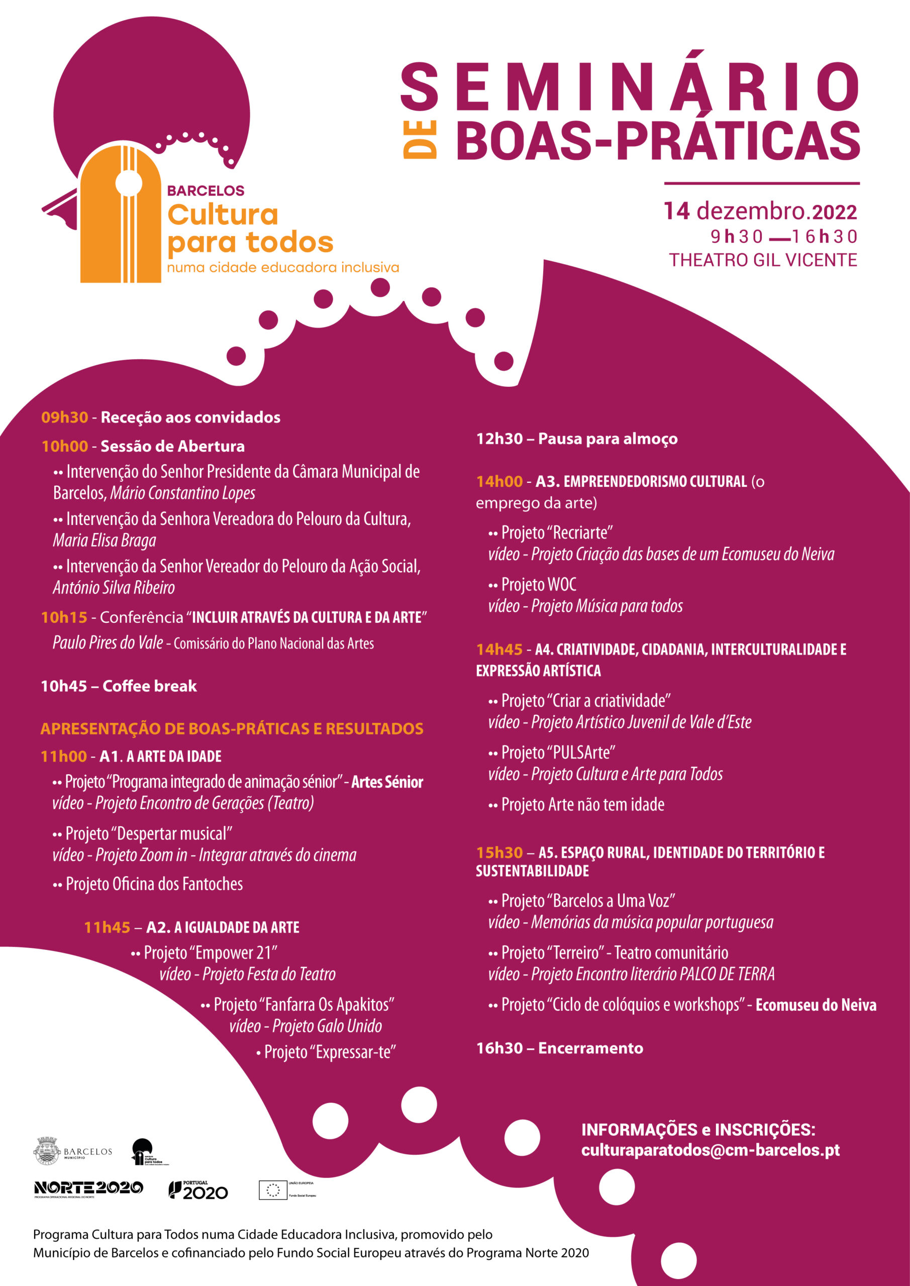 Este foi um programa muito intenso, que percorreu o concelho de Barcelos num formato absolutamente inovador, na sua essência, porque visou granjear a cultura pelo território barcelense, num formato descentralizador e em múltiplas aceções que a cultura e a criatividade podem assumir. Assim, o Seminário de Boas-Práticas do Programa "Cultura para Todos numa Cidade Inclusiva" representa o culminar de um vasto conjunto de projetos que durante o ano de 2022 dinamizaram o nosso território.