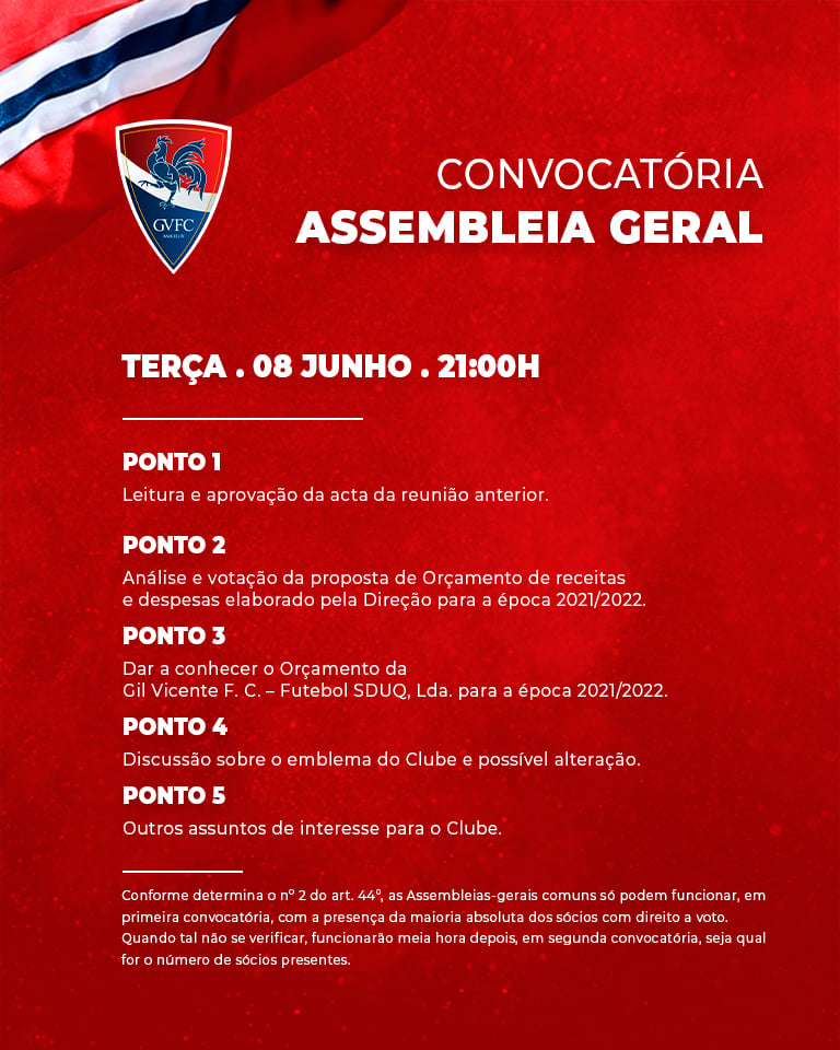 Para além dos pontos habituais, como a "análise e votação da proposta de orçamento de receitas e despesas elaborado pela direção para a época 2021/2022" e o ato de dar a conhecer o orçamento do clube para a próxima temporada, vai ser também promovida uma discussão sobre o emblema do clube. Em cima da mesa está uma proposta de alteração do símbolo dos galos, que terá de se aprovada pelos sócios.