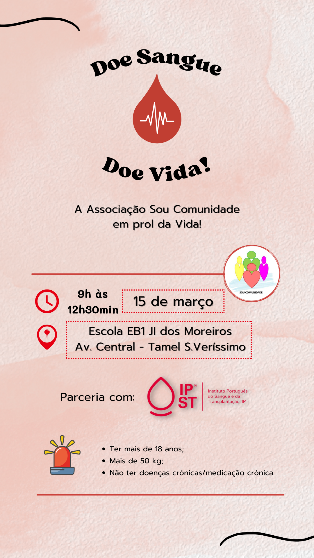 A Sou Comunidade, Associação Social e Cultural (Associação sem fins lucrativos), sediada em Tamel - S. Veríssimo, está a programar mais um dos seus Rastreios em Saúde no dia 15 de Março de 2025, às 9h-12h30 na Escola JI e EB1 dos Moreiros Tamel-S.Veríssimo.
