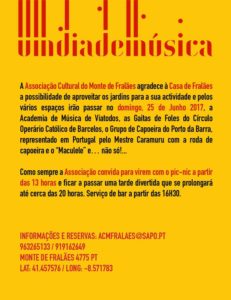 "Um dia de música" é a proposta da Associação Cultural do Monte de Fralães para a tarde do próximo domingo. A atividade permite desfrutar dos jardins e diversos espaços da Casa de Fralães onde atuarão alunos da Academia de Música de Viatodos, o grupo de Gaitas de Foles do Círculo Católico de Operários de Barcelos e o Grupo de Capoeira do Porto da Barra.