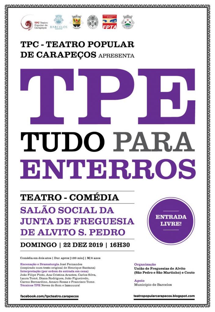 O Teatro Popular de Carapeços apresenta, este domingo, a peça “TPE – Tudo para Enterros” em Alvito São Pedro.
