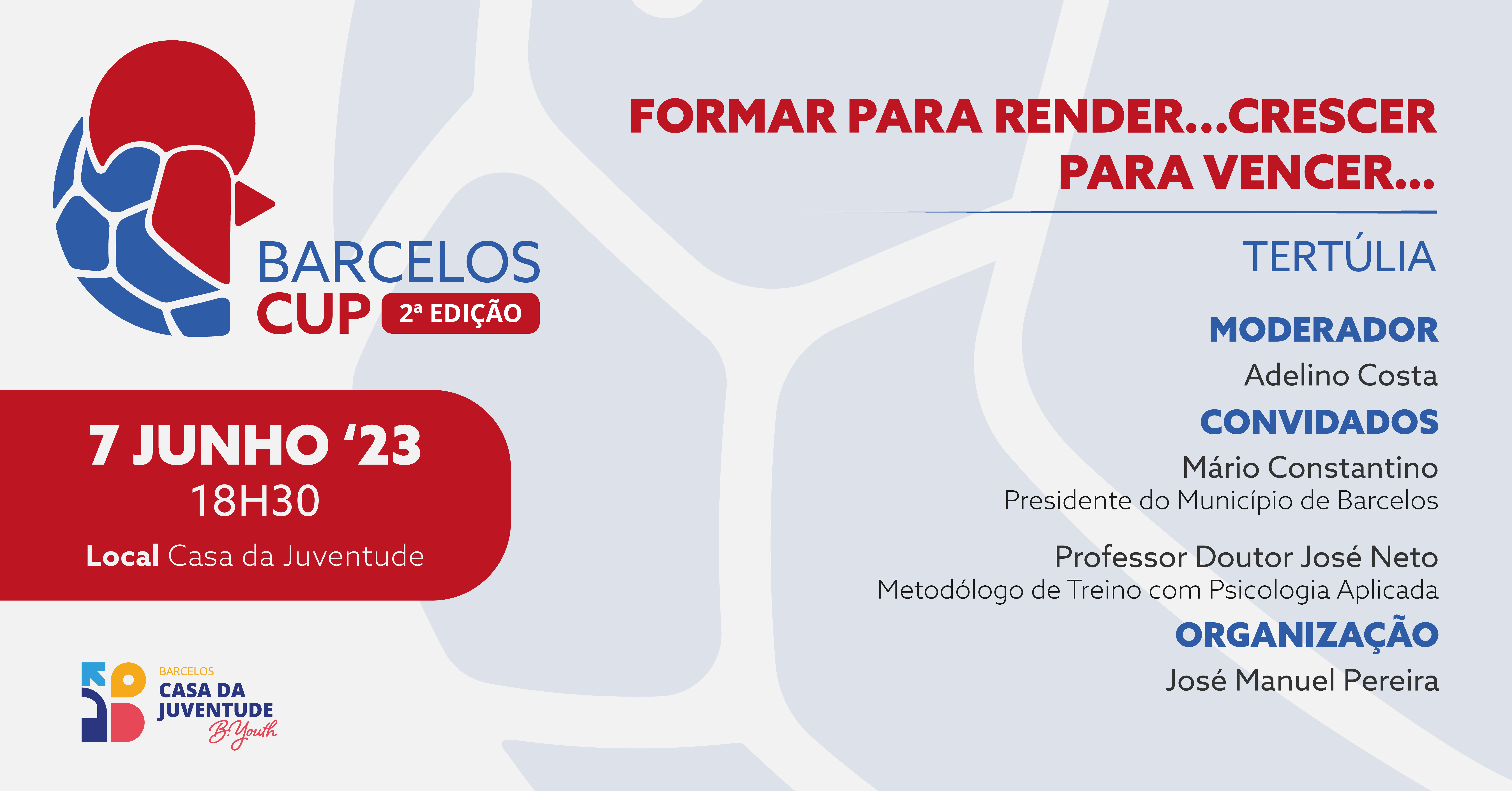 No âmbito da segunda edição do torneio infantil "Barcelos Cup", realiza-se no próximo dia 7 de junho, às 18h30, na Casa da Juventude, a Tertúlia "Formar para render...Crescer para vencer...". A iniciativa tem como principal objetivo abordar a formação desportiva e o crescimento dos jovens, e conta com as intervenções do presidente da Câmara Municipal de Barcelos, Mário Constantino Lopes, do metodólogo de treino com psicologia aplicada, professor José Neto, e com José Manuel Pereira, elemento da organização do torneio. A moderação do painel cabe a Adelino Costa.
