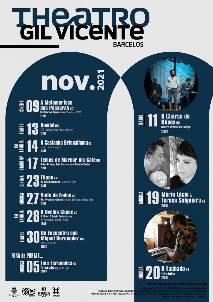 O teatro chega ao espaço vicentino no dia 11 de novembro, às 21h30, com “O Charco de Ulises” peça encenada pelo Centro Dramático Galego; “Hamlet” (dia 13 de novembro, às 21h30) pela CTB – Companhia de Teatro de Braga; e “Un Encuentro con Miguel Hernández” (dia 30 de novembro, às 21h30) pelo Teatro do Guirigai.