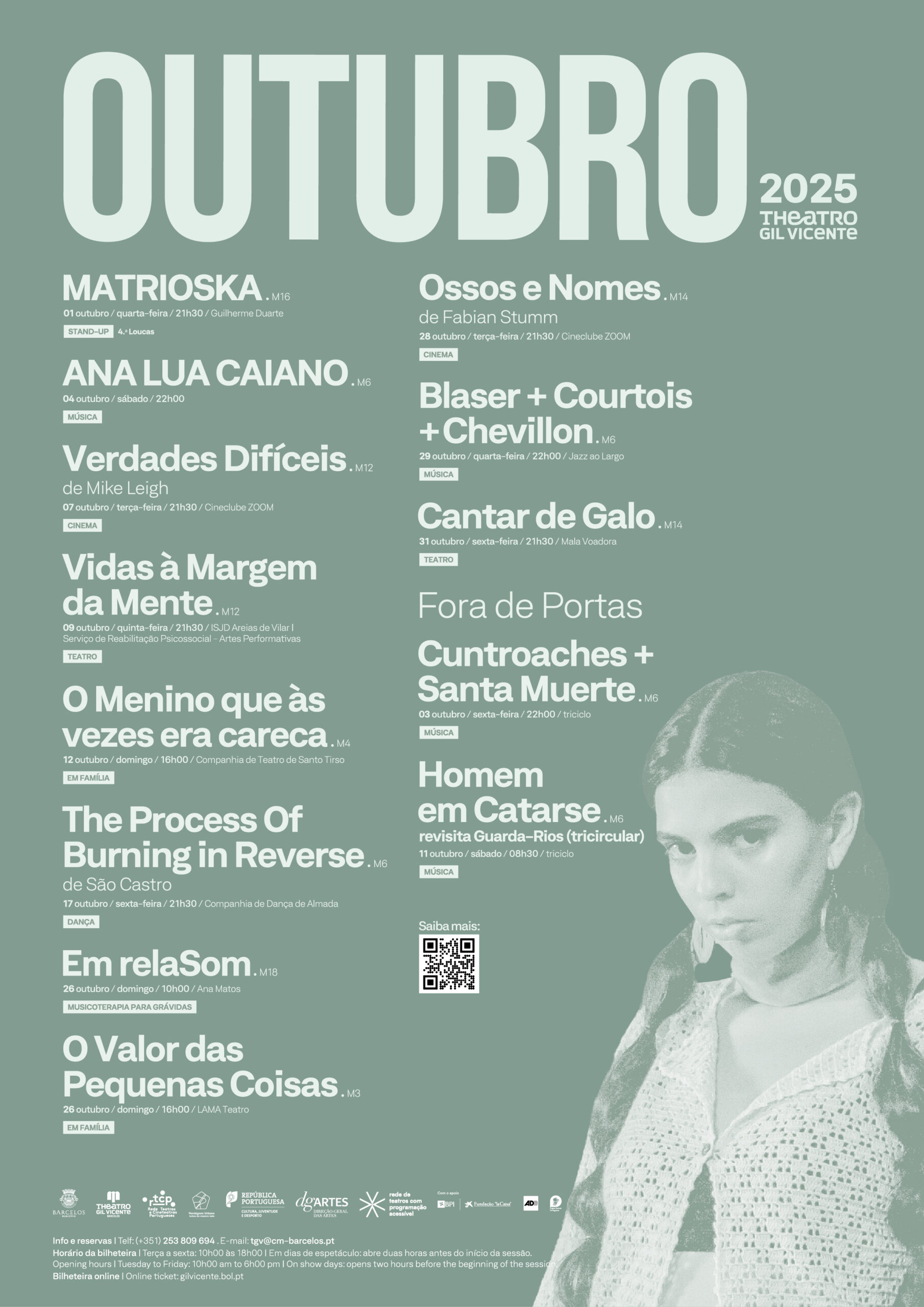 O Theatro Gil Vicente apresenta uma programação vibrante e multifacetada para o mês de outubro, com propostas que vão da comédia ao teatro e dança contemporânea, passando pela música nacional e internacional, sessões de cinema, atividades em família e concertos "fora de portas". A diversidade de linguagens e públicos confirma o papel do Theatro como polo cultural incontornável da cidade de Barcelos.